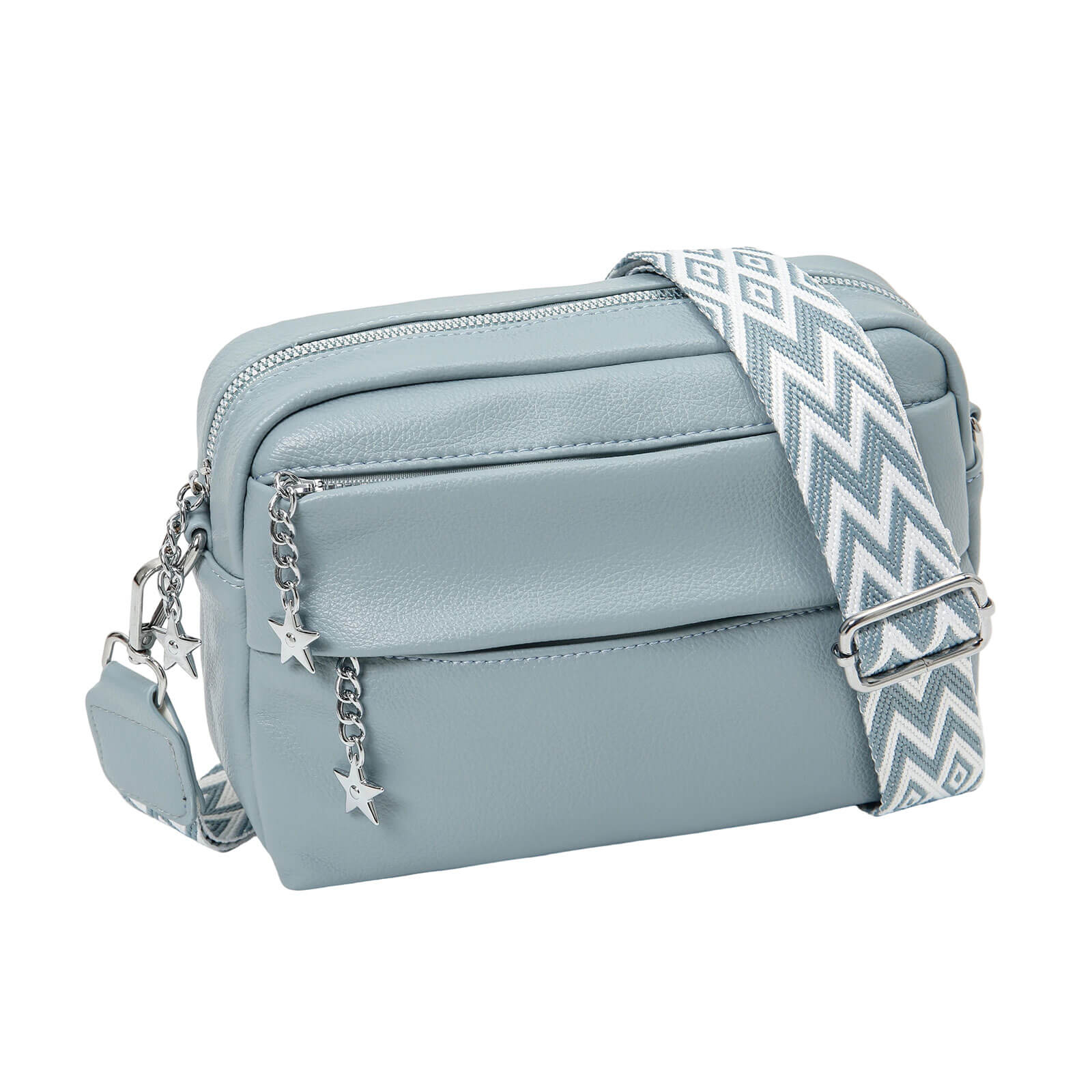 Das hochwertige Material in Kombination mit den modischen Metall-Details verleiht der Tasche eine edle Optik, während der auffällige verstellbare Schultergurt im Muster-Design einen modernen, trendigen Akzent setzt. Die Damen Clutch überzeugt durch ihr minimalistisches und gleichzeitig funktionales Design. Das geräumige Hauptfach mit Reißverschluss bietet ausreichend Platz für Smartphone, Geldbörse, Schlüssel und Kosmetikartikel. Ein zusätzliches Frontfach sorgt für schnellen Zugriff auf häufig genutzte Dinge. Die dekorativen Anhänger-Details setzen verspielte Highlights und unterstreichen den individuellen Look dieser Umhängetasche. Ob als klassische Clutch, lässige Crossbody Bag oder praktische Umhängetasche – dank des verstellbaren Gurtes lässt sich die Tasche flexibel tragen und perfekt an dein Outfit anpassen. Ideal kombinierbar zu Freizeit-Looks, City-Outfits oder eleganten Anlässen – diese Tasche ist ein echtes Must-have für stilbewusste Frauen.