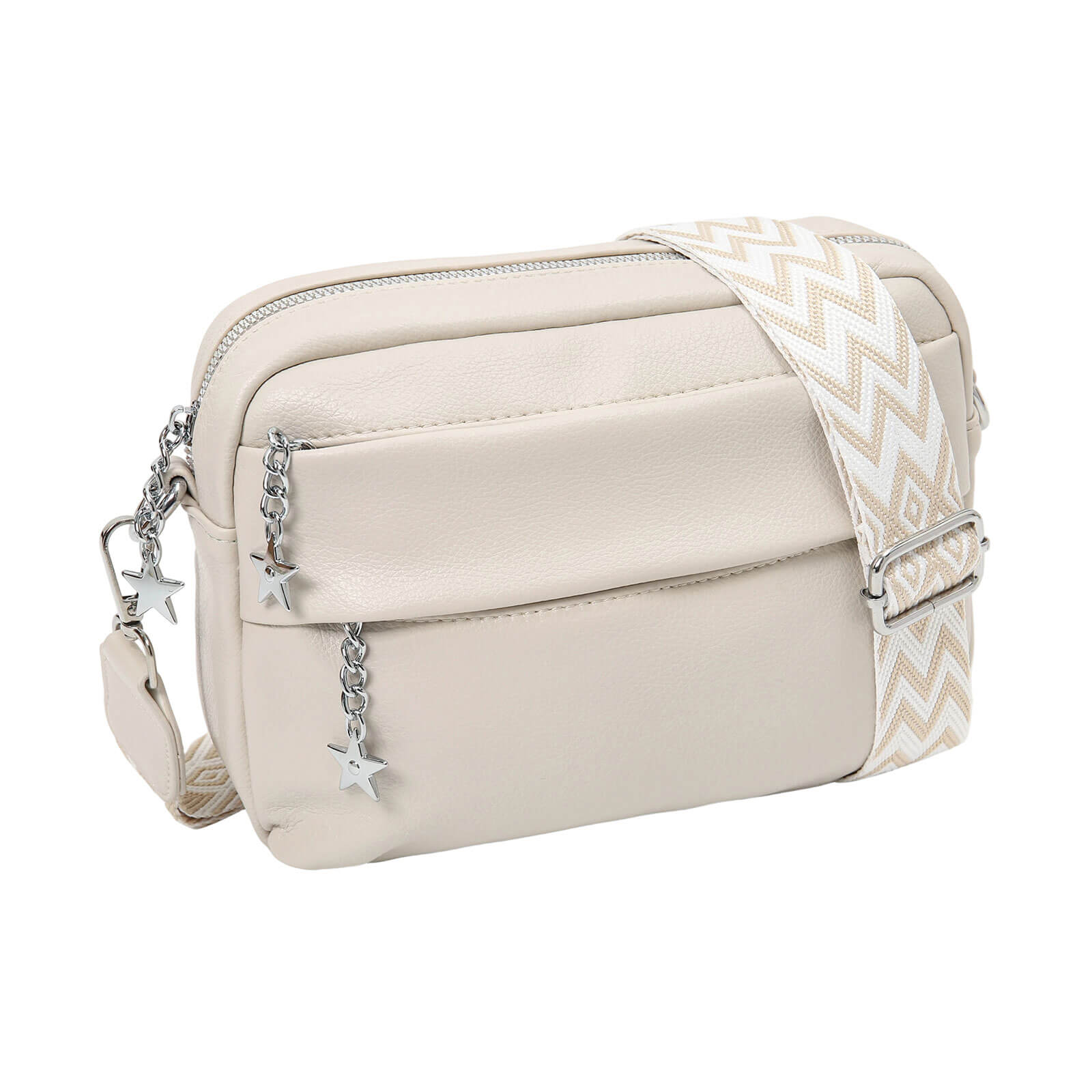 Das hochwertige Material in Kombination mit den modischen Metall-Details verleiht der Tasche eine edle Optik, während der auffällige verstellbare Schultergurt im Muster-Design einen modernen, trendigen Akzent setzt. Die Damen Clutch überzeugt durch ihr minimalistisches und gleichzeitig funktionales Design. Das geräumige Hauptfach mit Reißverschluss bietet ausreichend Platz für Smartphone, Geldbörse, Schlüssel und Kosmetikartikel. Ein zusätzliches Frontfach sorgt für schnellen Zugriff auf häufig genutzte Dinge. Die dekorativen Anhänger-Details setzen verspielte Highlights und unterstreichen den individuellen Look dieser Umhängetasche. Ob als klassische Clutch, lässige Crossbody Bag oder praktische Umhängetasche – dank des verstellbaren Gurtes lässt sich die Tasche flexibel tragen und perfekt an dein Outfit anpassen. Ideal kombinierbar zu Freizeit-Looks, City-Outfits oder eleganten Anlässen – diese Tasche ist ein echtes Must-have für stilbewusste Frauen.