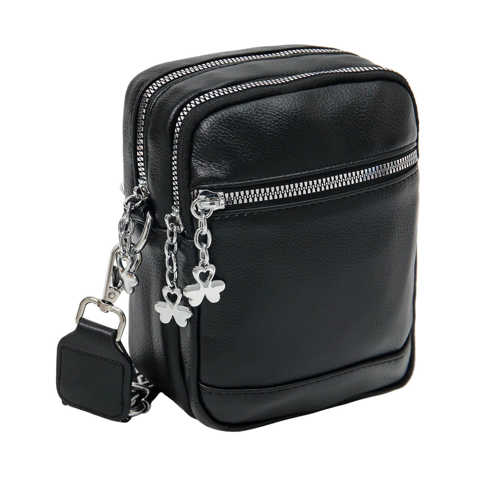 Das hochwertige Material in Lederoptik verleiht der Tasche eine elegante Ausstrahlung, während die silberfarbenen Reißverschlüsse und dekorativen Anhänger stilvolle Akzente setzen. Die Multi Bag überzeugt durch ihre clevere Aufteilung: Mehrere Reißverschlussfächer ermöglichen eine übersichtliche Organisation deiner Essentials wie Smartphone, Geldbörse, Schlüssel oder Kosmetik. Ein praktisches Frontfach sorgt für schnellen Zugriff auf wichtige Gegenstände, während das Hauptfach ausreichend Platz für alles bietet, was du unterwegs benötigst. So bleibt alles griffbereit und sicher verstaut. Dank des abnehmbaren und verstellbaren Schultergurts lässt sich die Tasche individuell tragen – ob als Crossbody Bag, Umhängetasche oder kompakte Handtasche. Die moderne, schlichte Optik macht die Multi Bag zum idealen Begleiter für unterschiedlichste Looks – von casual bis elegant. Perfekt für Alltag, City-Trips oder besondere Anlässe.