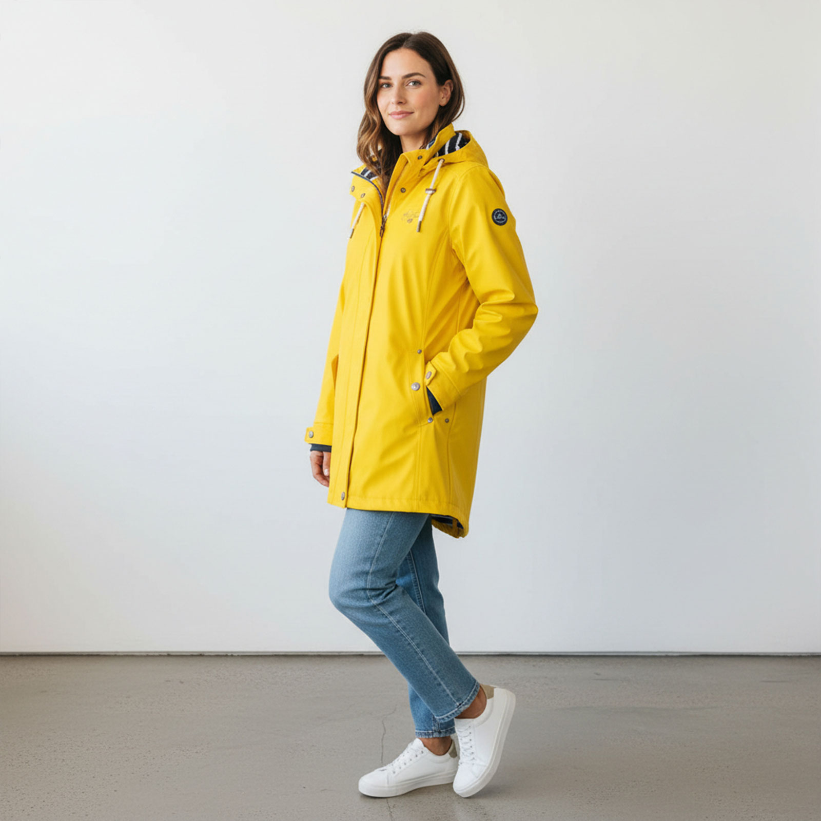 Mit seinem leicht taillierten Schnitt sorgt der Regenmantel für eine feminine Silhouette, während die wind- und wasserdichte Verarbeitung mit verschweißten Nähten optimalen Schutz vor schlechtem Wetter bietet. Das maritime Streifen-Innenfutter verleiht dem Mantel einen stilvollen Look und macht ihn zu einem echten Hingucker. Die mehrfach verstellbare Kapuze schützt zuverlässig vor Wind und Regen, während die Taillenregulierung durch Druckknöpfe am Rücken eine individuell anpassbare Passform ermöglicht. Der abgedeckte Zwei-Wege-Reißverschluss auf der Frontseite sorgt für zusätzlichen Komfort und schützt vor eindringender Nässe. Zwei praktische Außentaschen sowie eine Innentasche bieten genügend Stauraum für deine Essentials. Dank der individuell anpassbaren Armbündchen mit Druckknöpfen und den innenliegenden elastischen Bündchen bleibt der Regen draußen und die Wärme drinnen. Ein besonderes Highlight ist das verlängerte Rückenteil mit Kordelzug, mit dem du die Passform nach Belieben regulieren kannst. Das Material aus 100% Polyester mit einer Außenbeschichtung aus 100% Polyurethan verleiht dem Mantel eine weiche und geschmeidige Oberfläche, die angenehm zu tragen ist.