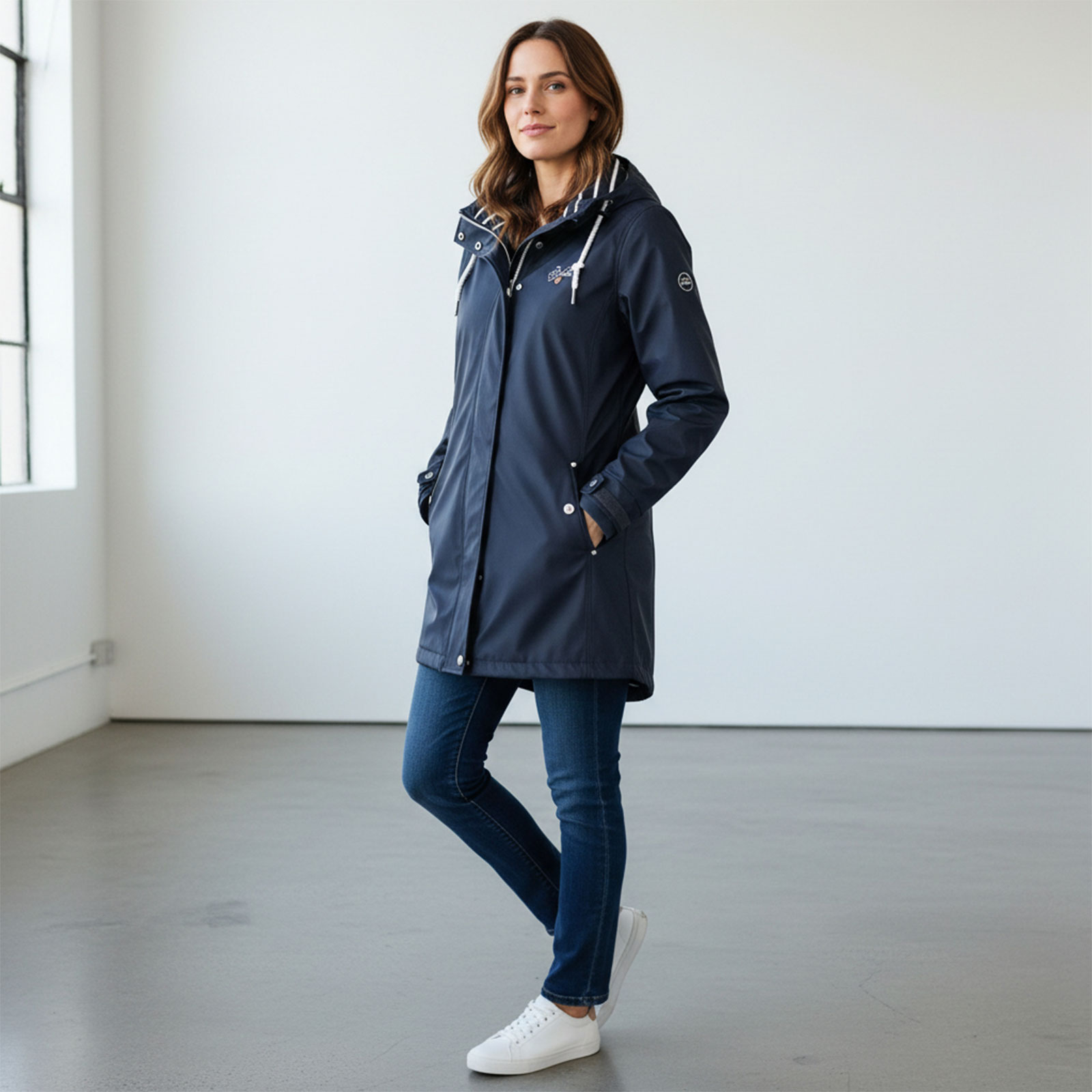 Mit seinem leicht taillierten Schnitt sorgt der Regenmantel für eine feminine Silhouette, während die wind- und wasserdichte Verarbeitung mit verschweißten Nähten optimalen Schutz vor schlechtem Wetter bietet. Das maritime Streifen-Innenfutter verleiht dem Mantel einen stilvollen Look und macht ihn zu einem echten Hingucker. Die mehrfach verstellbare Kapuze schützt zuverlässig vor Wind und Regen, während die Taillenregulierung durch Druckknöpfe am Rücken eine individuell anpassbare Passform ermöglicht. Der abgedeckte Zwei-Wege-Reißverschluss auf der Frontseite sorgt für zusätzlichen Komfort und schützt vor eindringender Nässe. Zwei praktische Außentaschen sowie eine Innentasche bieten genügend Stauraum für deine Essentials. Dank der individuell anpassbaren Armbündchen mit Druckknöpfen und den innenliegenden elastischen Bündchen bleibt der Regen draußen und die Wärme drinnen. Ein besonderes Highlight ist das verlängerte Rückenteil mit Kordelzug, mit dem du die Passform nach Belieben regulieren kannst. Das Material aus 100% Polyester mit einer Außenbeschichtung aus 100% Polyurethan verleiht dem Mantel eine weiche und geschmeidige Oberfläche, die angenehm zu tragen ist.