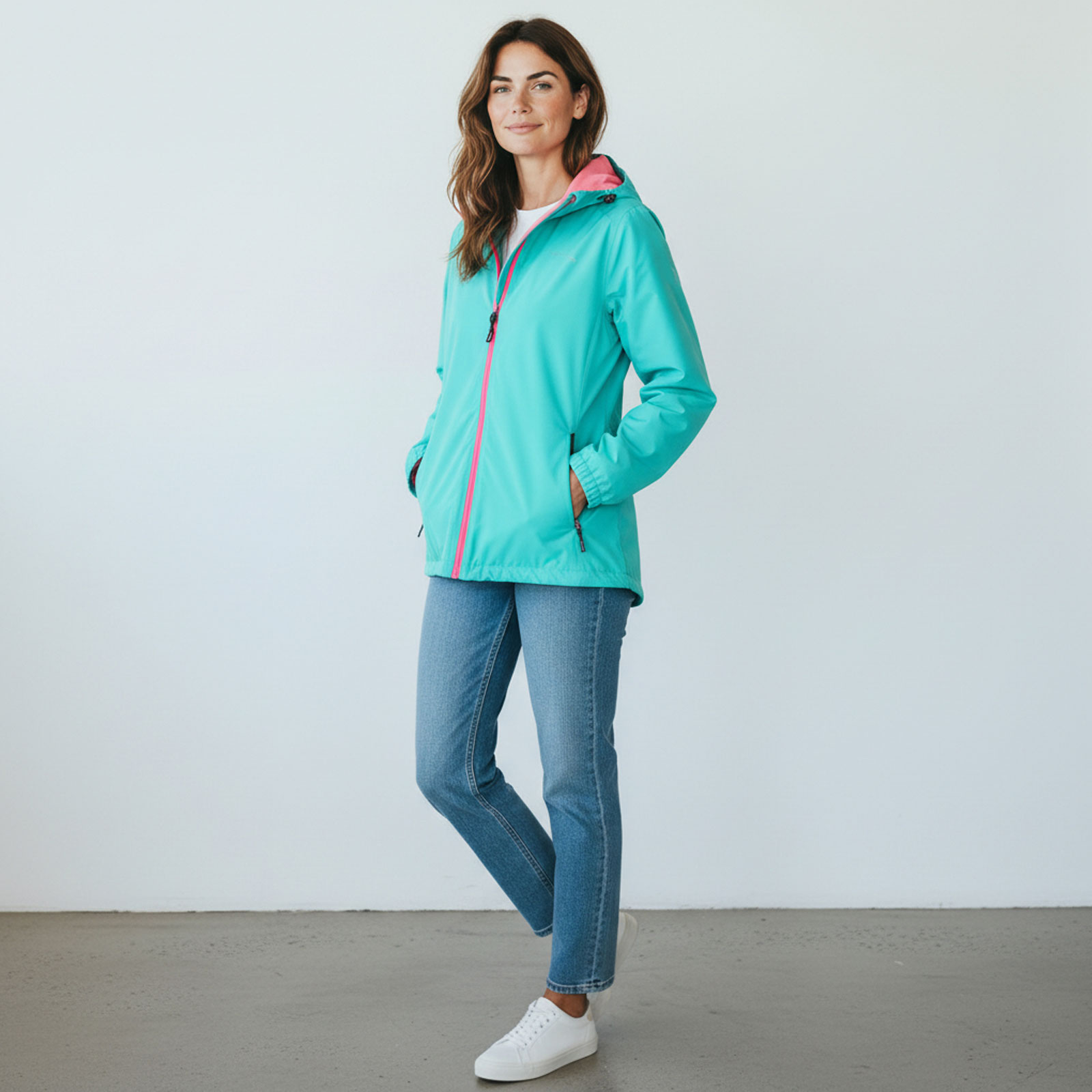 Das atmungsaktive, wind- und wasserdichte Material sowie die verschweißten Nähte halten Nässe zuverlässig ab und sorgen gleichzeitig für ein angenehmes Körperklima. Der taillierte Schnitt unterstreicht die feminine Silhouette, ohne dabei die Bewegungsfreiheit einzuschränken. Die verstellbare Kapuze mit Vorderschirm schützt Gesicht und Kopf effektiv vor Regen und Wind. Dank des wasserdichten Zwei-Wege-Frontreißverschlusses lässt sich die Jacke flexibel anpassen – ideal beim Gehen, Sitzen oder Radfahren. Durchdachte Details wie abgedeckte Seitentaschen mit Reißverschluss, eine praktische Innentasche sowie elastische Armbündchen machen diese Damen Funktionsjacke besonders alltagstauglich. Das verlängerte Rückenteil bietet zusätzlichen Schutz, während der verstellbare Bundzug für eine individuelle Passform sorgt. Besonders praktisch: Die Jacke ist einrollbar und in einer Seitentasche verstaubar – perfekt für unterwegs.