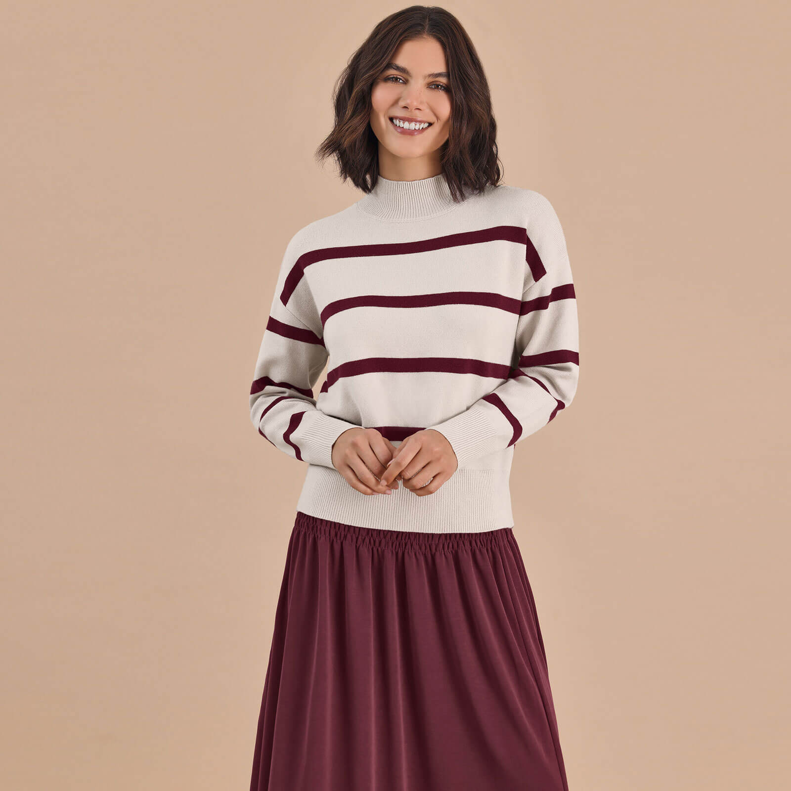 Das zeitlose Muster verleiht dem Pullover einen frischen, maritimen Look, während die überschnittenen Schultern für eine lässige Silhouette sorgen. Der Stehkragen bietet nicht nur ein stilvolles Detail, sondern schützt auch angenehm vor kühleren Temperaturen. Dank der gerippten Bündchen an Ärmeln und Saum sitzt der Pullover perfekt und bleibt dauerhaft in Form. Ob im Büro, in der Freizeit oder beim entspannten Stadtbummel – dieser Damenpullover mit Streifen und Stehkragen überzeugt durch seinen angenehmen Tragekomfort, seine hochwertige Verarbeitung und sein stilvolles Design.