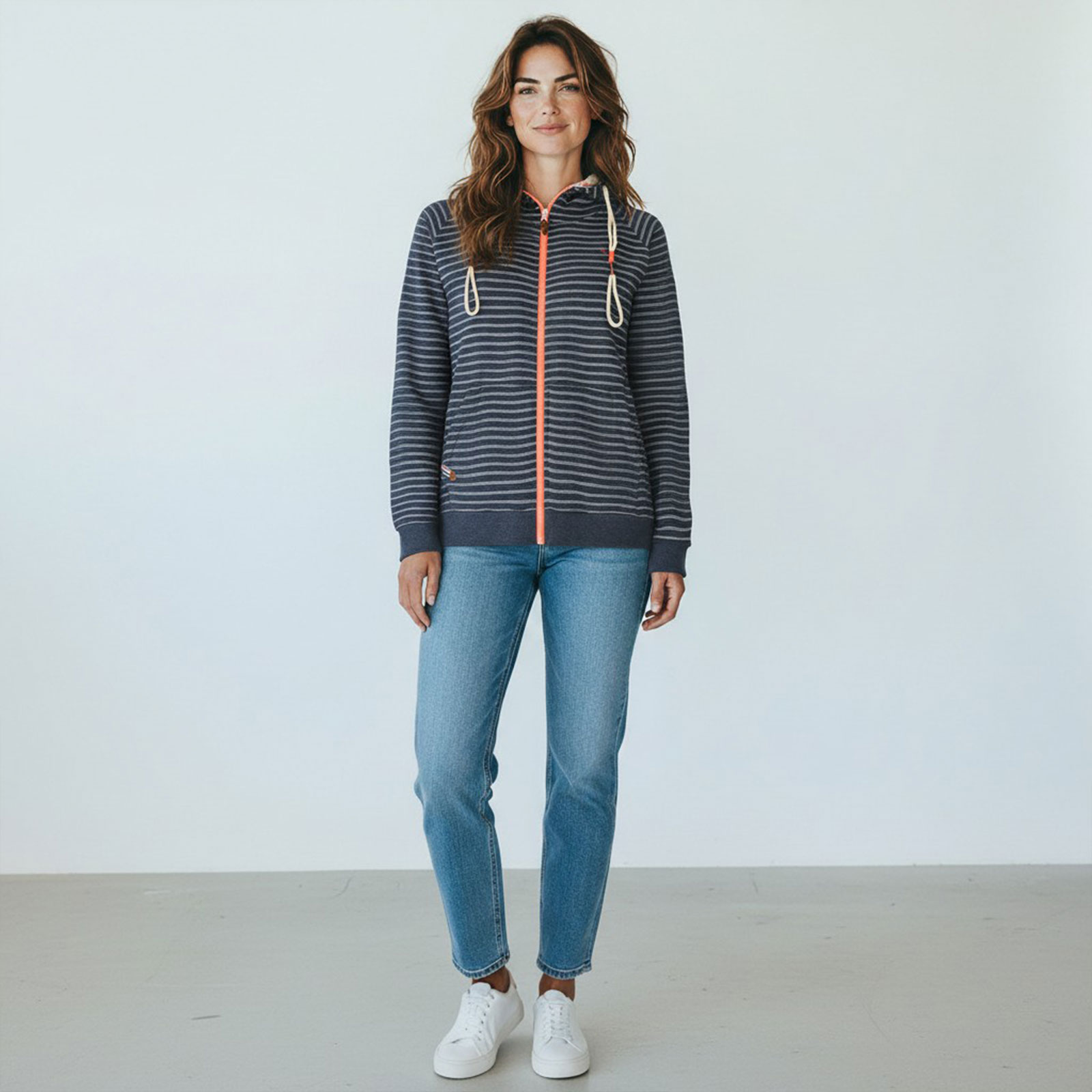 Diese Damen-Sweatjacke ist ein vielseitiges Lieblingsstück – ideal für entspannte Outfits mit maritimem Flair.