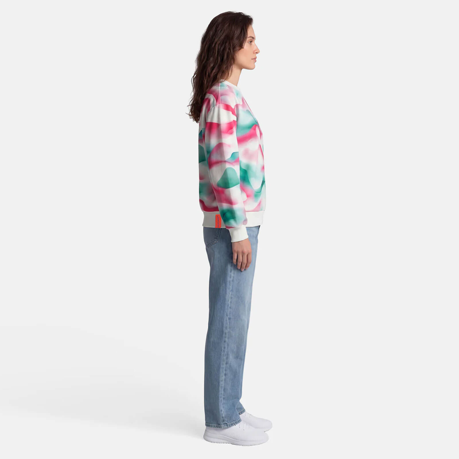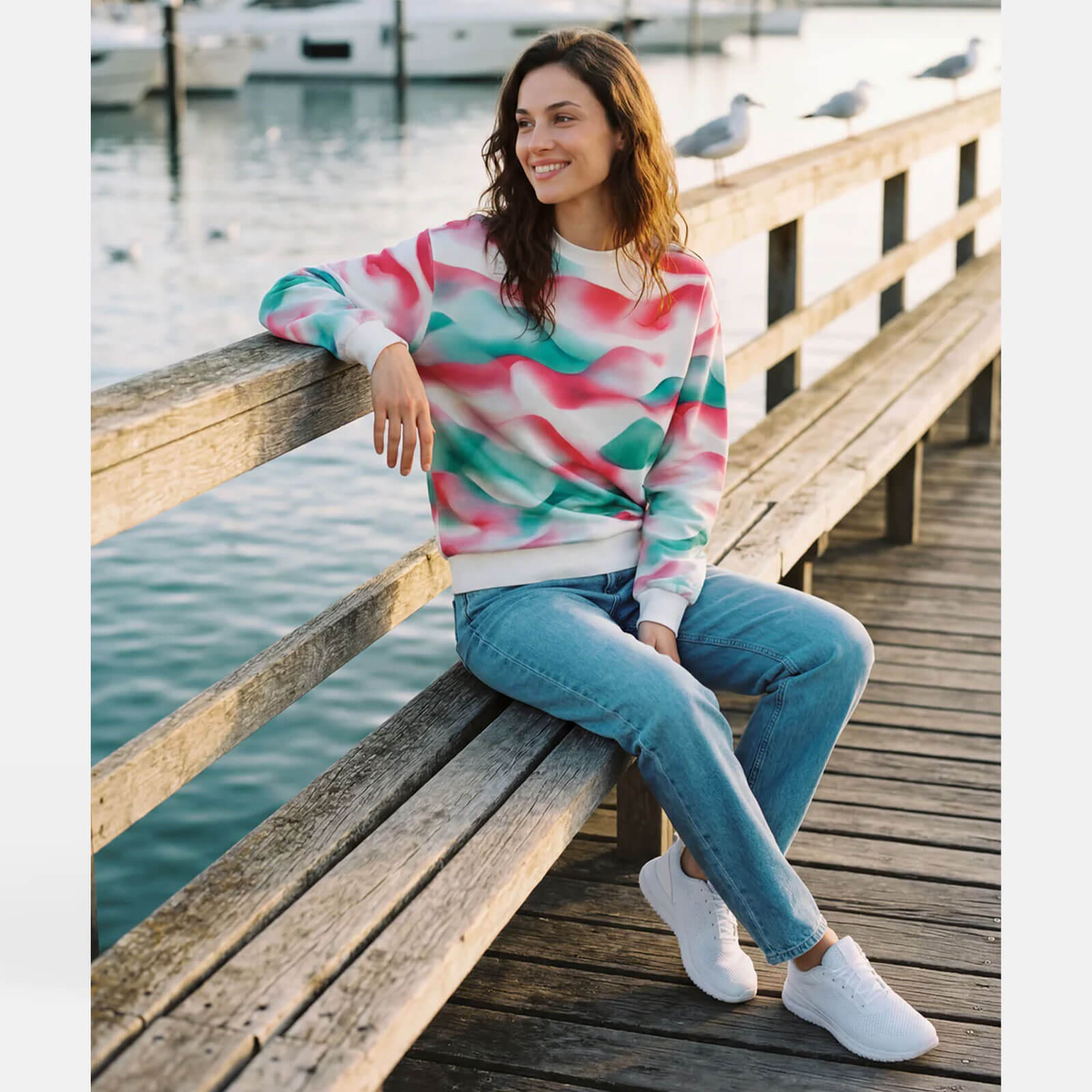 Der bunte Wellen-Allover-Print sorgt für einen lebendigen, modernen Look und macht den Pullover zu einem echten Hingucker – perfekt für alle, die modische Akzente lieben. Der klassische Rundhalsausschnitt verleiht dem Damenpullover eine zeitlose Note und macht ihn vielseitig kombinierbar, egal ob zu Jeans, Leggings oder Rock. Bündchen an Saum und Ärmeln sorgen für eine angenehme Passform und einen bequemen Sitz ohne Verrutschen. Dank der hochwertigen Qualität aus 310 g softbrushed Sweatware überzeugt der Pullover mit einer besonders weichen, innen angerauten Oberfläche. Das Material liegt angenehm auf der Haut, hält wohlig warm und bietet optimalen Tragekomfort.