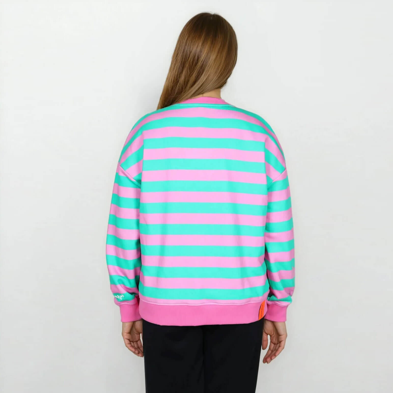 Das zeitlose Streifen-Design macht den Pullover zu einem vielseitigen Begleiter für Alltag und Freizeit, während der dezente Print auf der Rückseite für einen überraschenden, modischen Hingucker sorgt. Der klassische Rundhalsausschnitt verleiht dem Damenpullover eine feminine und unkomplizierte Optik, die sich mühelos kombinieren lässt – ob zu Jeans, Stoffhose oder Rock. Bündchen an Saum und Ärmeln sorgen für eine bequeme Passform und einen sauberen Sitz. Gefertigt aus French Terry light brushed (300 g/m²) überzeugt der Pullover mit einer angenehm weichen, leicht angerauten Innenseite. Das Material fühlt sich besonders komfortabel auf der Haut an und macht den Pullover ideal für kühlere Tage, entspannte Freizeitlooks oder gemütliche Stunden zu Hause.
