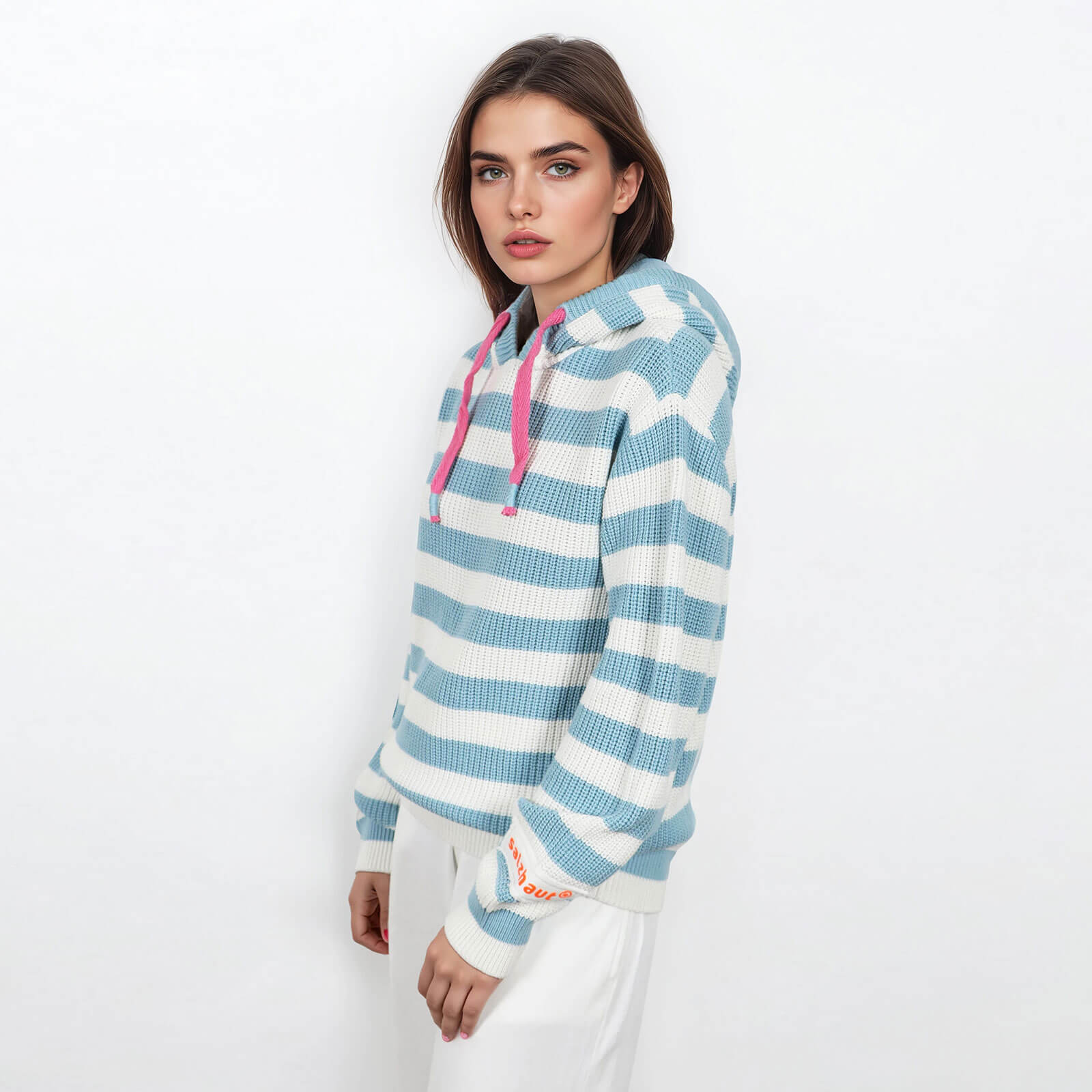 Der modische Strickhoodie Velozipee für Damen vereint gemütlichen Komfort mit einem modernen Look im maritimen Stil. Das ca. 3 cm hohe Streifen-Design verleiht dem Pullover eine zeitlose Optik, die sich vielseitig kombinieren lässt – perfekt für entspannte Tage, Spaziergänge am Meer oder den urbanen Alltag.
