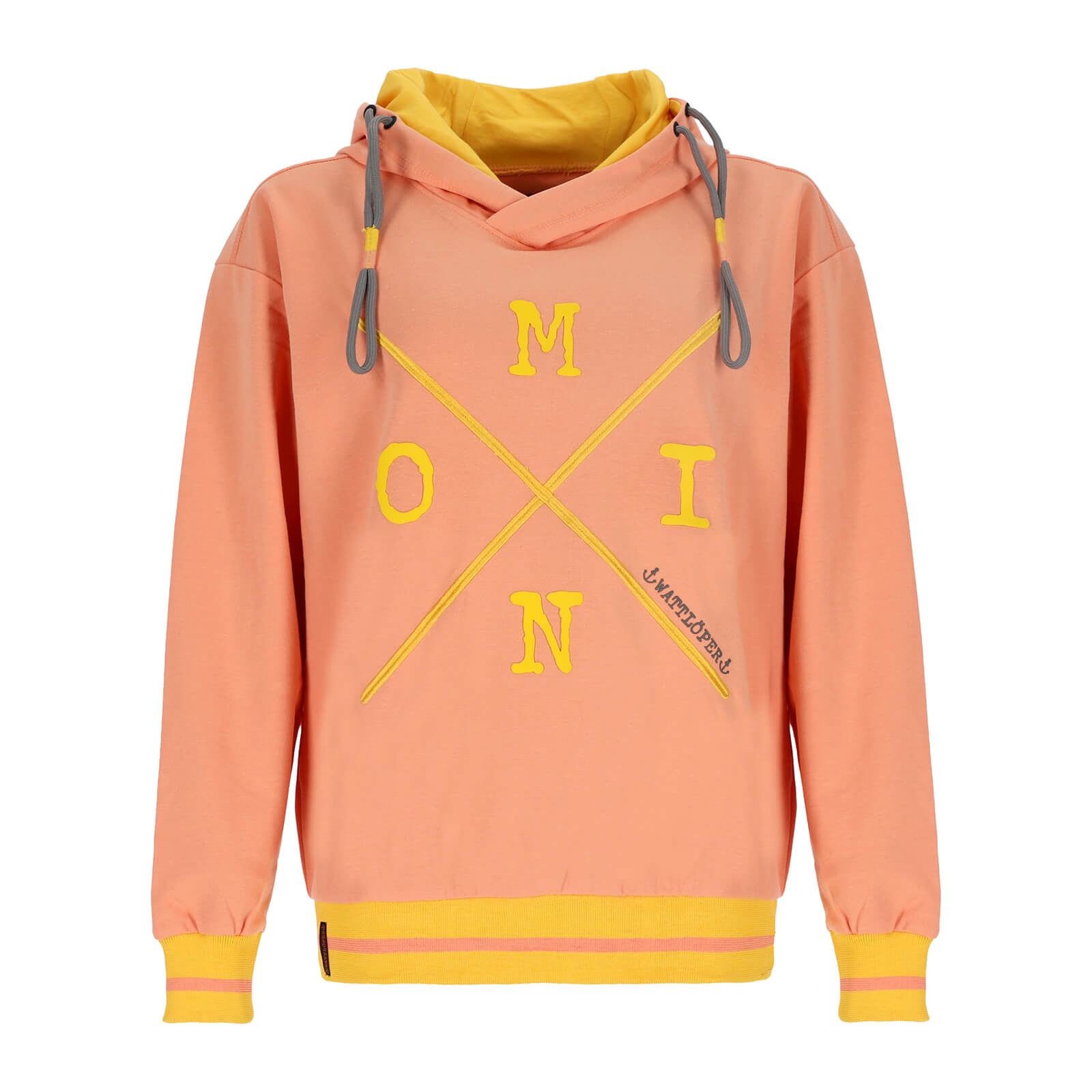 Wattlöper Damen Sweathoody mit Schriftzug X-Stick Moin - Pullover mit Kapuze mit 3-farbigen Bändern in Apricot Größe M