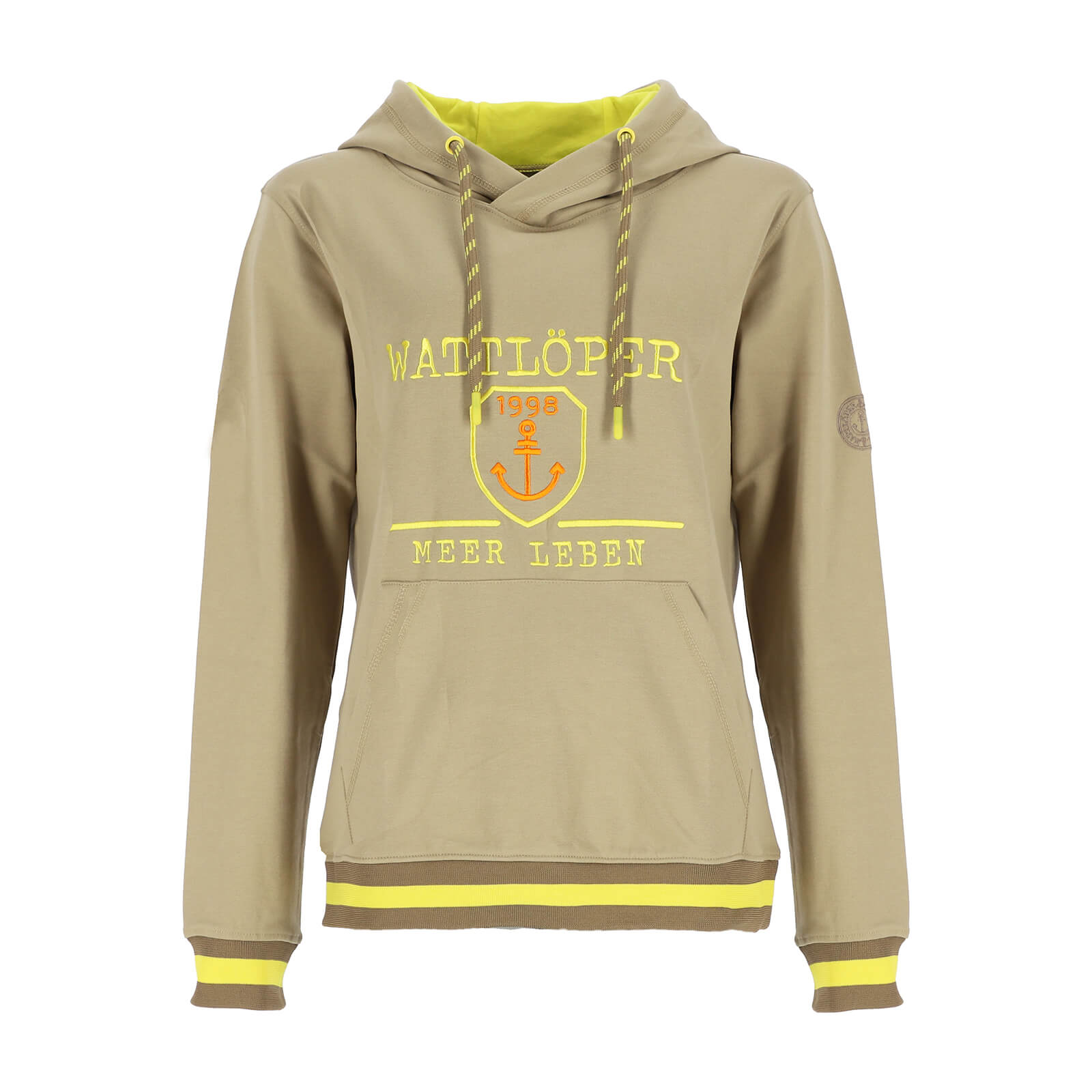 Wattlöper Unisex Sweathoody mit Front-Stickerei Anker-Wappen und Meer leben - Kapuzenpullover mit Kängurutasche in Beige Größe S