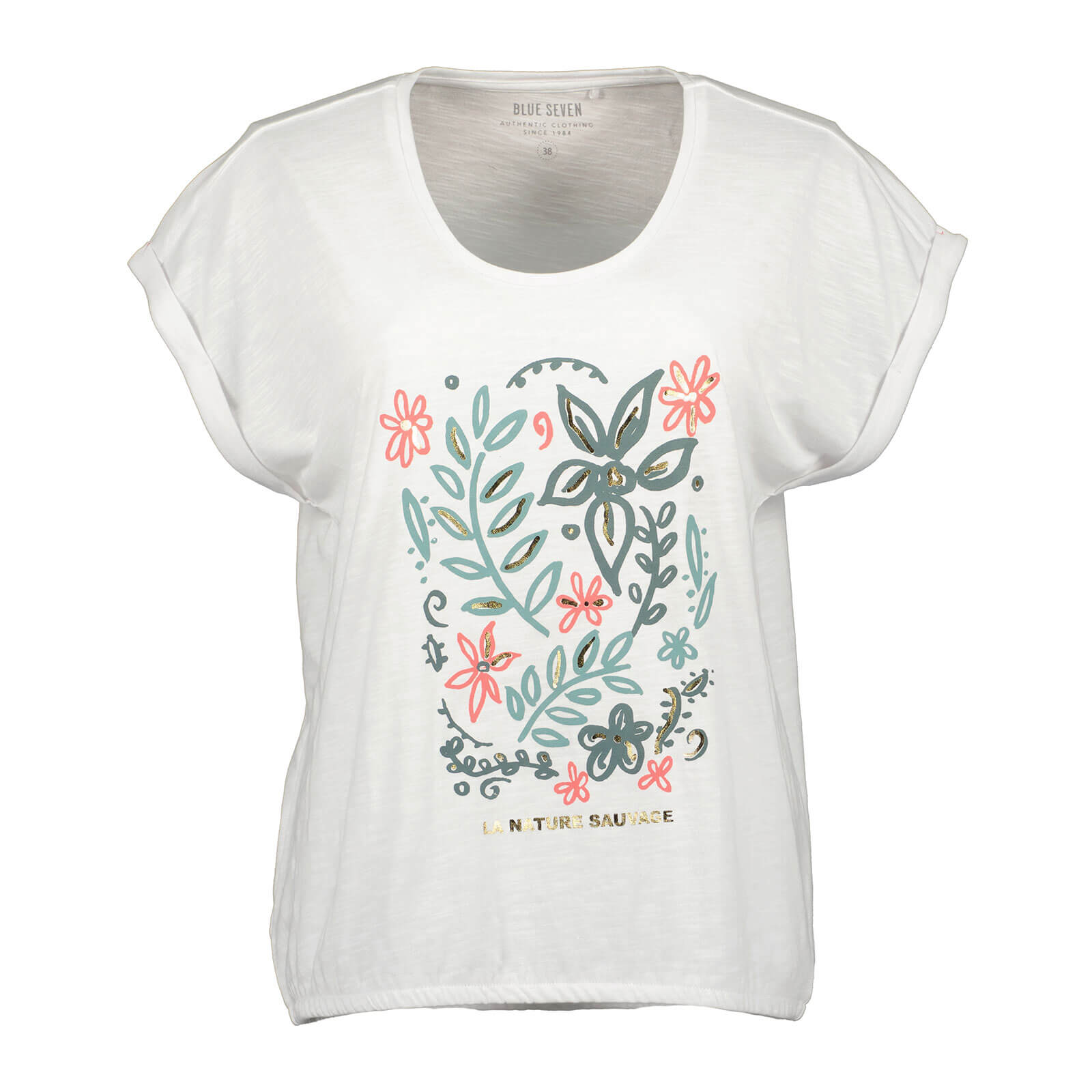 Blue Seven Damen T-Shirt mit floralem Front-Print - Kurzarm-Shirt mit überschnittenen Schultern in Weiß Größe 38