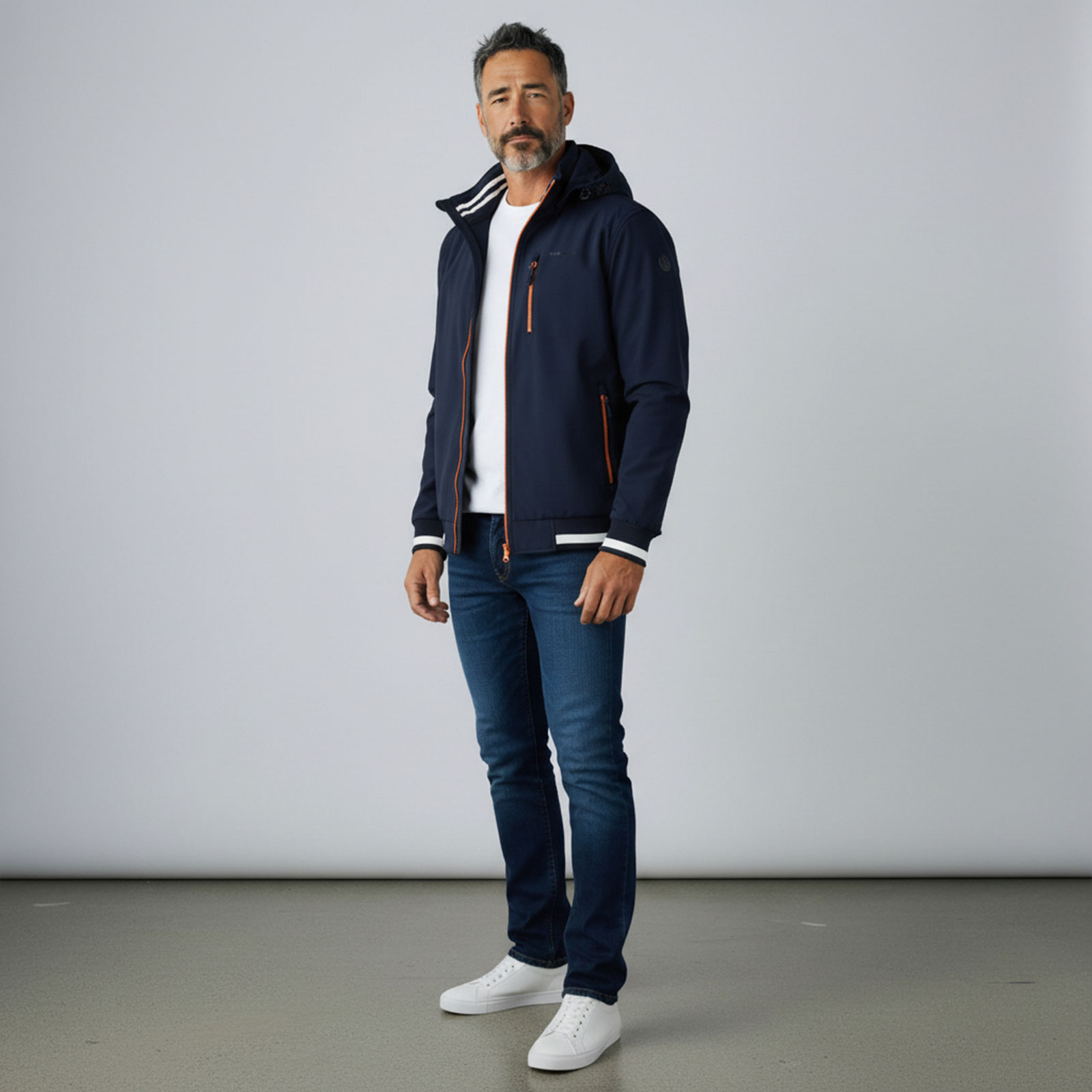 Dank des hochwertigen Funktionsmaterials mit Innenfutter ist die Jacke atmungsaktiv, wind- und wasserabweisend, wodurch Sie bei wechselhaftem Wetter stets bestens ausgestattet sind. Die mehrfach verstellbare und abnehmbare Kapuze sorgt für Flexibilität, während der Zwei-Wege-Front-Reißverschluss mit Kinnschutz zusätzlichen Komfort und Schutz bietet. Funktionalität wird durch die seitlichen Reißverschlusstaschen, die Brusttasche und die Innentasche mit Reißverschluss unterstrichen – ideal für die sichere Aufbewahrung von persönlichen Gegenständen. Mit individuell anpassbaren Armbündchen und einem verlängerten Rückenteil passt sich der Blouson perfekt an Ihren Körper und Ihre Bewegungen an. Ob beim Spaziergang, Wandern oder im Alltag – diese Jacke kombiniert praktischen Nutzen mit einem zeitlosen, sportlichen Look.