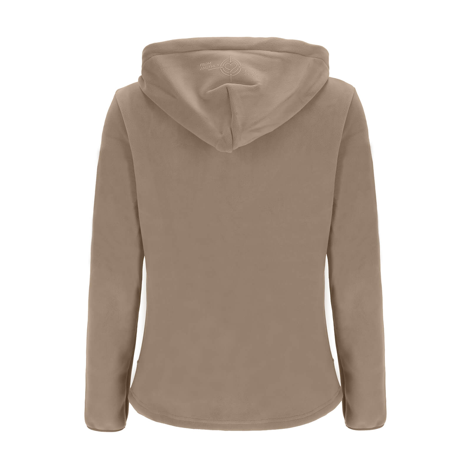 Die gebondete Fleecequalität mit samtig weicher Außenseite sorgt für ein angenehmes Tragegefühl, während die beigefarbene Innenseite stilvolle Kontraste setzt. Die angeschnittene Kapuze mit zwei unterschiedlich farbigen Kordeln unterstreicht den modischen Charakter der Jacke und verleiht ihr einen sportiv-lässigen Touch. Mit einer Rückenlänge von ca. 64 cm bietet diese Fleecejacke eine optimale Passform, die sich angenehm an den Körper schmiegt. Ein dezenter Marken-Schriftzug auf der Brust rundet das Design geschmackvoll ab.