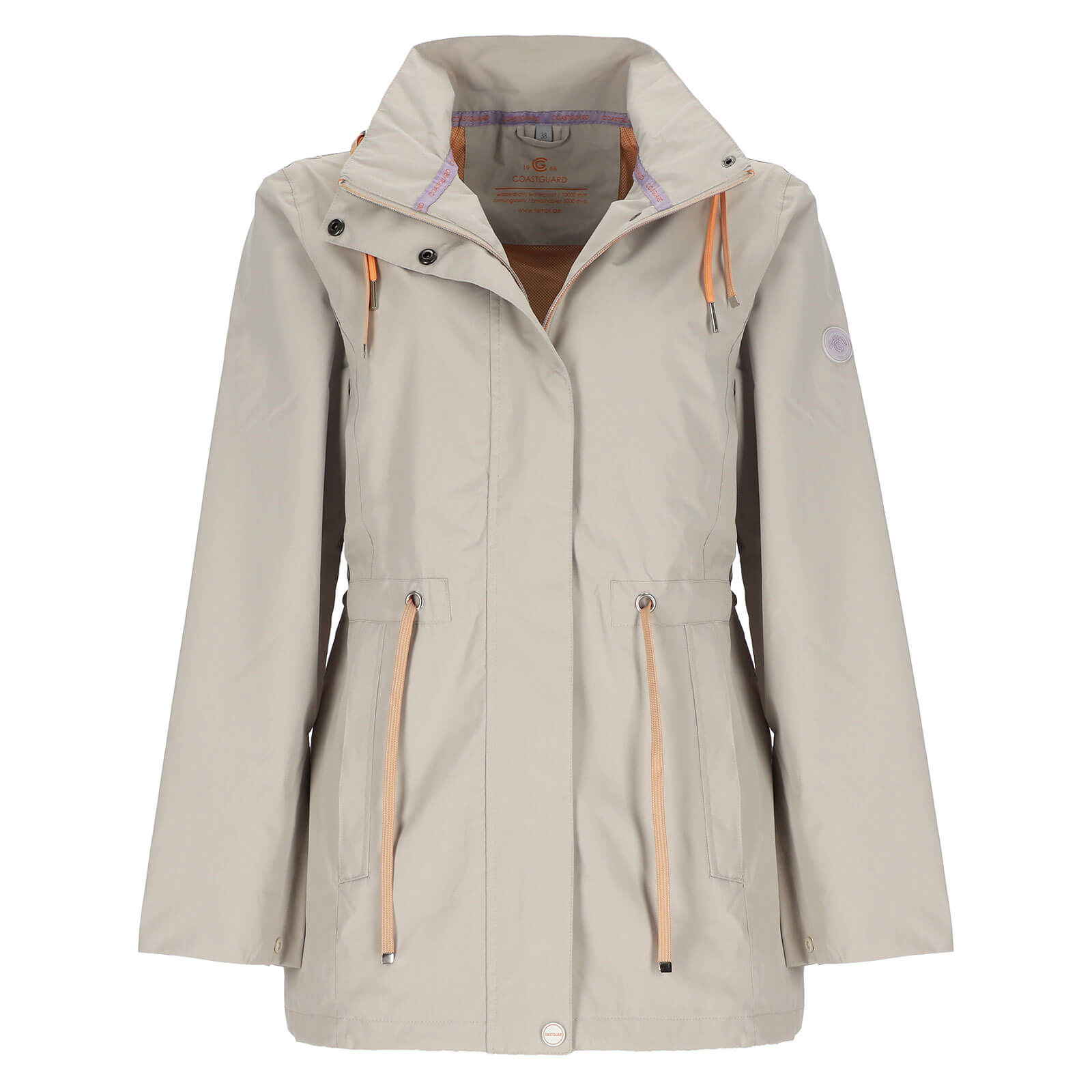 Mit einer Rückenlänge von ca. 76 cm sorgt die Outdoor-Jacke für eine angenehme Bedeckung und eine sportlich-feminine Passform. Dank einer Wassersäule von 10.000 mm ist die Jacke zuverlässig wasserdicht, während die verschweißten Nähte zusätzlichen Schutz vor Nässe bieten. Gleichzeitig sorgt eine Atmungsaktivität von 5.000 MVP dafür, dass Feuchtigkeit von innen nach außen transportiert wird – für ein angenehmes Körperklima auch bei Bewegung. Das Meshfutter in Apricot setzt nicht nur einen modischen Akzent, sondern unterstützt auch die Luftzirkulation im Inneren der Jacke. Die abnehmbare Kapuze mit Zugband bietet flexiblen Wetterschutz und lässt sich individuell anpassen. Ein integrierter Taillenzug sorgt für eine feminine Silhouette und optimalen Sitz. Der weitenverstellbare Saum ermöglicht zusätzliche Anpassung, während die durchdachte Verarbeitung hohen Tragekomfort garantiert. Drei praktische Reißverschlusstaschen bieten sicheren Stauraum für wichtige Essentials wie Smartphone, Schlüssel oder Geldbörse – ideal für unterwegs.