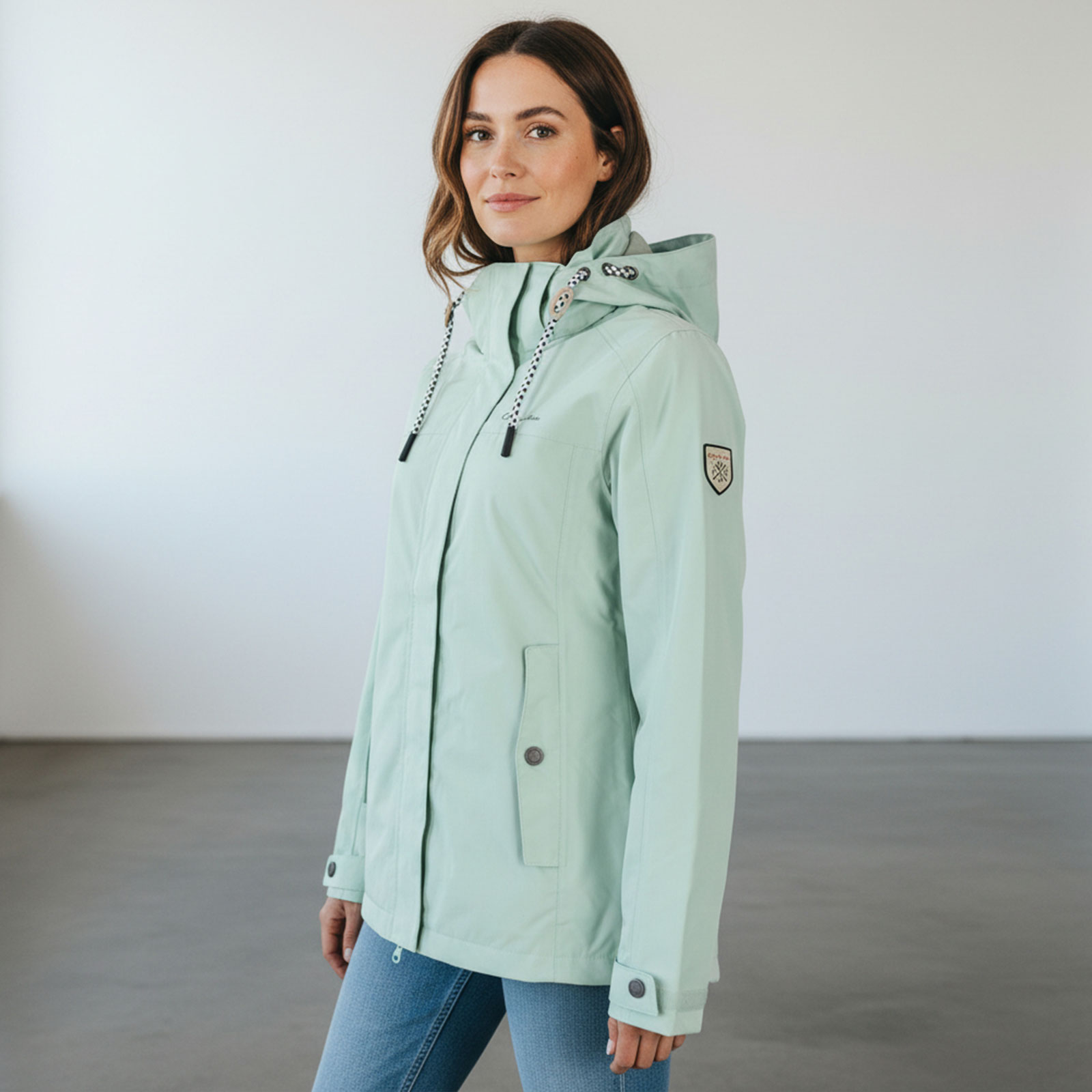 Diese Funktionsjacke ist atmungsaktiv, winddicht und wasserdicht, ideal für wechselhaftes Wetter. Die hochwertigen, verschweißten Nähte bieten zusätzlichen Schutz vor Wind und Regen. Der taillierte Schnitt der Jacke schmeichelt der Figur, während die verstellbare Taillenregulierung eine individuelle Anpassung ermöglicht. Die verstellbare und abnehmbare Kapuze bietet Flexibilität und Schutz in unterschiedlichen Wetterlagen. Der Kinnschutz und der abgedeckte 2-Wege-Frontreißverschluss sorgen für zusätzlichen Komfort und Schutz vor den Elementen. Innen- und Seitentaschen mit Reißverschluss bieten sicheren Stauraum für Ihre Essentials. Das gestreifte Innenfutter gibt der Jacke einen besonderen, modischen Touch. Die individuell anpassbaren Armbündchen und das verlängerte Rückenteil bieten sowohl Komfort als auch Schutz.