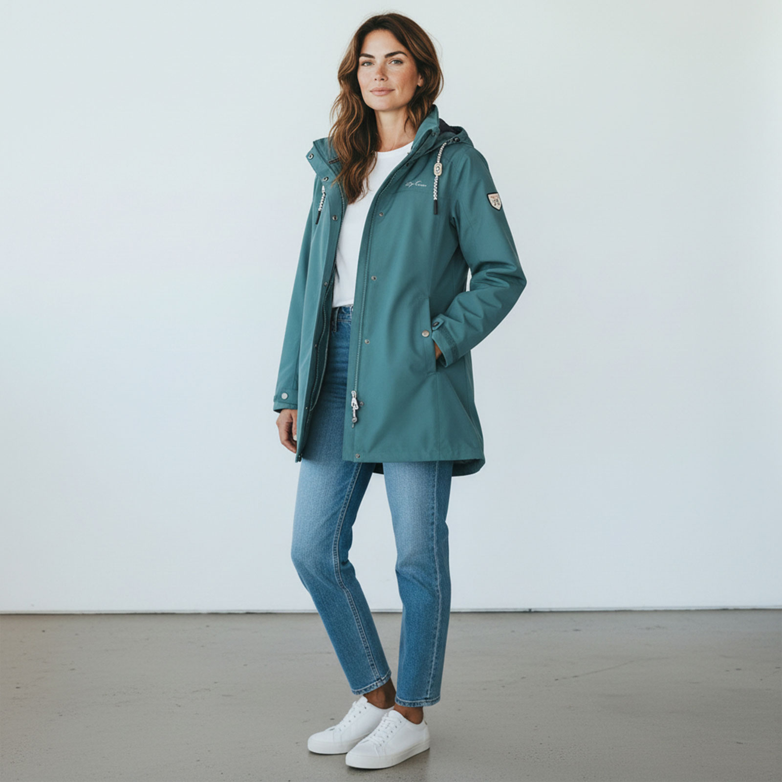 Das atmungsaktive, wind- und wasserdichte Funktionsmaterial schützt zuverlässig vor Wind und Regen, während verschweißte Nähte die Wetterfestigkeit zusätzlich erhöhen. Mit ihrem taillierten Schnitt und der verstellbaren Taillenregulierung betont der Mantel Ihre Figur und sorgt gleichzeitig für höchsten Tragekomfort. Die mehrfach verstellbare und abnehmbare Kapuze bietet flexible Anpassungsmöglichkeiten, ideal für wechselhaftes Wetter. Der abgedeckte Zwei-Wege-Front-Reißverschluss mit Kinnschutz verhindert, dass Kälte eindringt, und macht die Jacke besonders komfortabel. Abgedeckte Seitentaschen mit Reißverschluss und praktische Innentaschen bieten sicheren Stauraum für all Ihre wichtigen Utensilien – vom Smartphone bis zum Schlüssel. Ein besonderes Designmerkmal dieses Mantels ist das verlängerte Rückenteil, das zusätzlichen Schutz vor Wind und Wetter bietet. Die individuell anpassbaren Armbündchen sorgen für eine perfekte Passform und zusätzlichen Komfort. Dezente Details wie der Marken-Schriftzug auf der linken Brust und das Marken-Badge am linken Ärmel verleihen der Funktionsjacke eine hochwertige Optik.