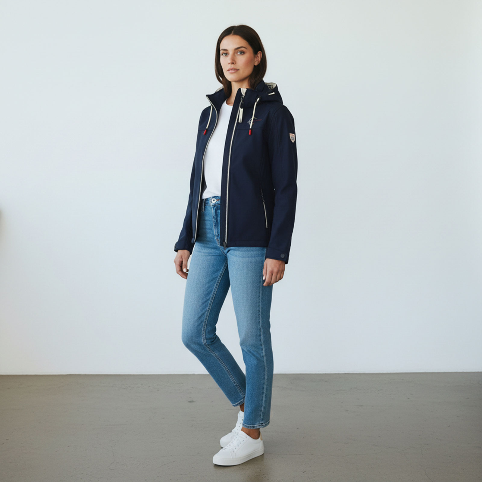 Die Jacke besteht aus hochwertigem 3-Lagen Stretch Softshell mit hydrophiler PU-Membrane und einem wärmenden Fleece-Innenfutter. Diese Materialien garantieren optimalen Schutz vor Wind und Regen, während die atmungsaktiven Eigenschaften ein angenehmes Tragegefühl sicherstellen. Der taillierte Schnitt unterstreicht die feminine Silhouette und bietet zugleich maximalen Komfort. Die mehrfach verstellbare und abnehmbare Kapuze schützt zuverlässig vor plötzlichen Regenschauern, während der Kinnschutz und der Zwei-Wege-Front-Reißverschluss zusätzlichen Komfort bieten. Für funktionale Vielseitigkeit verfügt die Jacke über zwei seitliche Reißverschlusstaschen, in denen Sie wichtige Dinge sicher verstauen können. Mit den individuell anpassbaren Armbündchen und dem verlängerten Rückenteil bietet die Jacke zusätzliche Flexibilität und Schutz vor Wind. Dezente Details wie der Marken-Schriftzug auf der Brust und das Marken-Badge am linken Ärmel runden das elegante Design ab.
