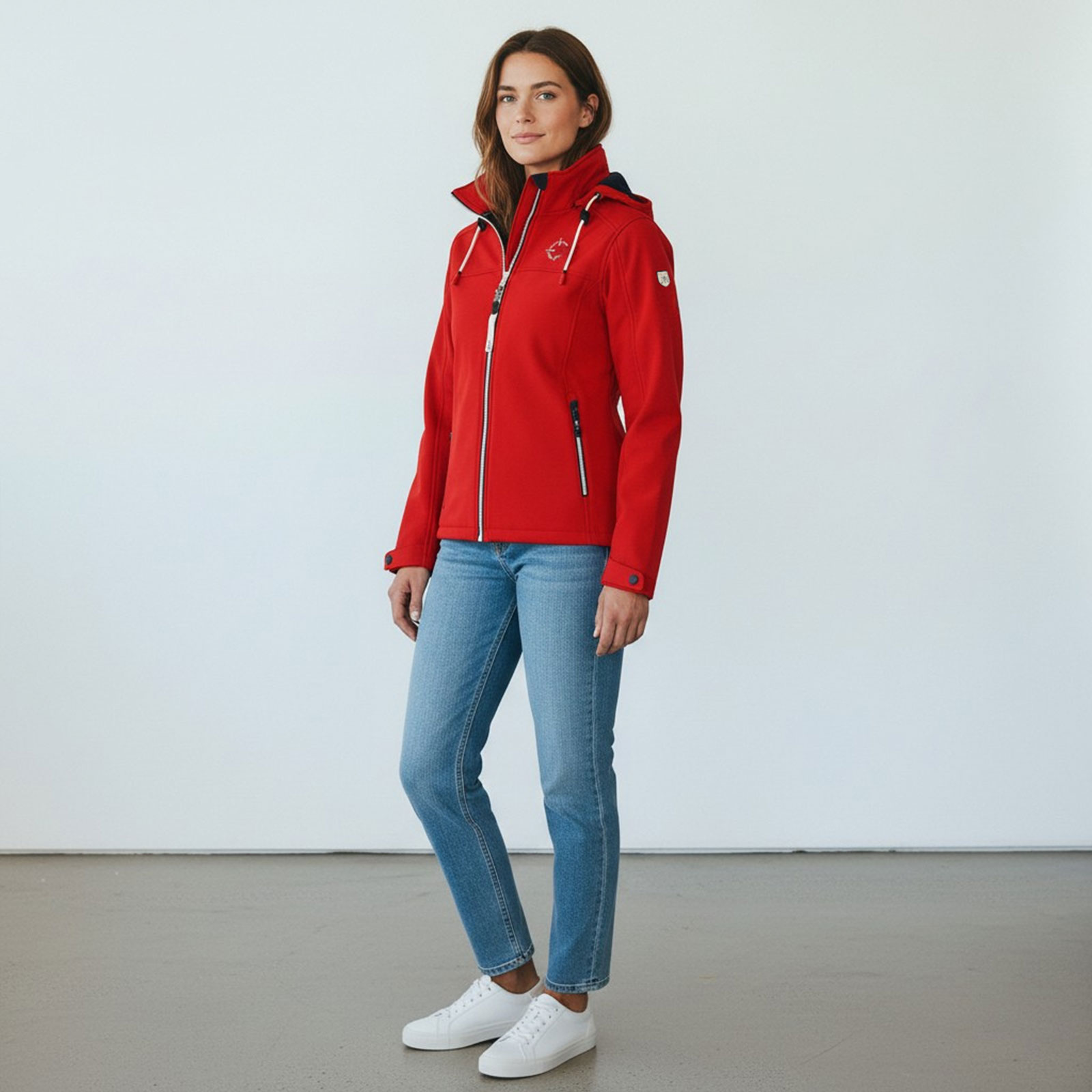 Die Jacke besteht aus hochwertigem 3-Lagen Stretch Softshell mit hydrophiler PU-Membrane und einem wärmenden Fleece-Innenfutter. Diese Materialien garantieren optimalen Schutz vor Wind und Regen, während die atmungsaktiven Eigenschaften ein angenehmes Tragegefühl sicherstellen. Der taillierte Schnitt unterstreicht die feminine Silhouette und bietet zugleich maximalen Komfort. Die mehrfach verstellbare und abnehmbare Kapuze schützt zuverlässig vor plötzlichen Regenschauern, während der Kinnschutz und der Zwei-Wege-Front-Reißverschluss zusätzlichen Komfort bieten. Für funktionale Vielseitigkeit verfügt die Jacke über zwei seitliche Reißverschlusstaschen, in denen Sie wichtige Dinge sicher verstauen können. Mit den individuell anpassbaren Armbündchen und dem verlängerten Rückenteil bietet die Jacke zusätzliche Flexibilität und Schutz vor Wind. Dezente Details wie der Marken-Schriftzug auf der Brust und das Marken-Badge am linken Ärmel runden das elegante Design ab.