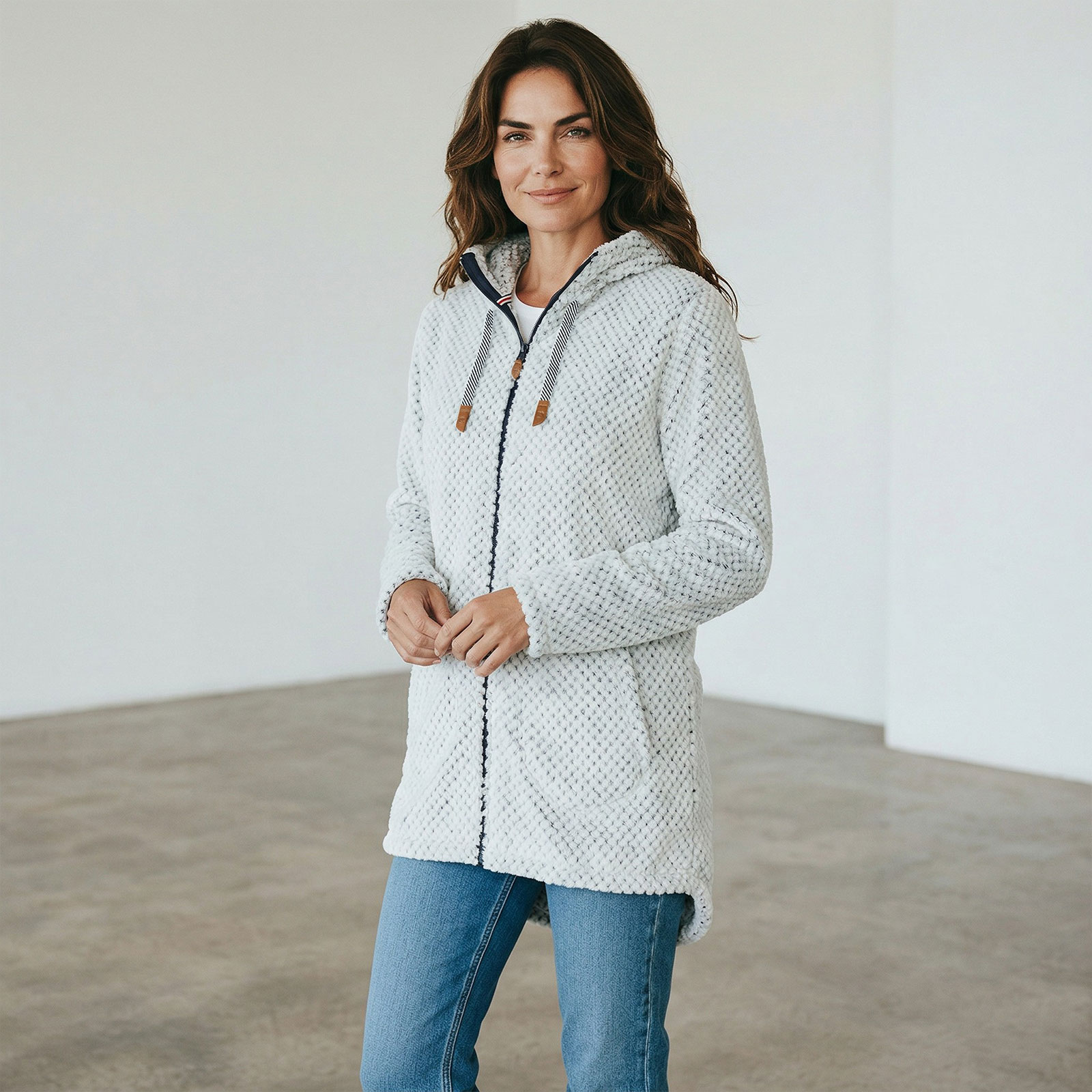 Die Kapuze mit Kordelband und die seitlichen Eingrifftaschen bieten nicht nur praktischen Nutzen, sondern auch optimalen Tragekomfort. Der durchgehende Front-Reißverschluss erleichtert das An- und Ausziehen und bietet zusätzlichen Schutz vor kühlem Wind. Die fein abgestimmten Akzente verleihen dem Mantel eine besondere Note und unterstreichen den maritimen Charakter. Egal ob beim Spaziergang an der Küste oder im urbanen Großstadtdschungel, dieser Fleecemantel setzt stilsichere Akzente. Dieser Strickfleecemantel lässt sich hervorragend mit verschiedenen Outfits kombinieren. Er passt sowohl zu einem entspannten Casual-Look als auch zu einer eleganteren Garderobe und macht ihn somit zu einem echten Allrounder für jede Gelegenheit. Gefertigt aus hochwertigen Materialien, bietet dieser Fleecemantel eine langlebige Qualität, die Sie über viele Saisons hinweg begleiten wird. Er ist nicht nur ein modisches Statement, sondern auch eine Investition in langlebige Garderobe.