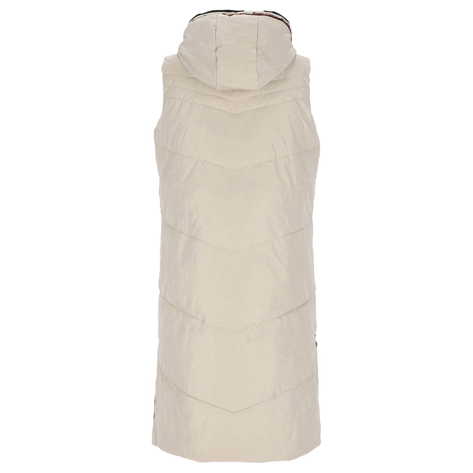 Der figurumschmeichelnde, lange Schnitt mit einer Rückenlänge von ca. 106 cm sorgt für angenehme Wärme und ein modernes, elegantes Erscheinungsbild. Die angeschnittene Kapuze mit Kordelband schützt zuverlässig vor Wind und verleiht der Weste in Kombination mit dem Tape in Kontrastfarbe einen sportlich-dynamischen Akzent. Besonders praktisch: Die geknöpften Seitenschlitze sorgen für mehr Bewegungsfreiheit und unterstreichen gleichzeitig den modischen Look. Zwei Taschen im oberen Bereich mit schwarzen 2-Wege-Reißverschlüssen bieten sicheren Stauraum für Handy, Schlüssel oder andere Essentials – funktional und stilvoll zugleich.