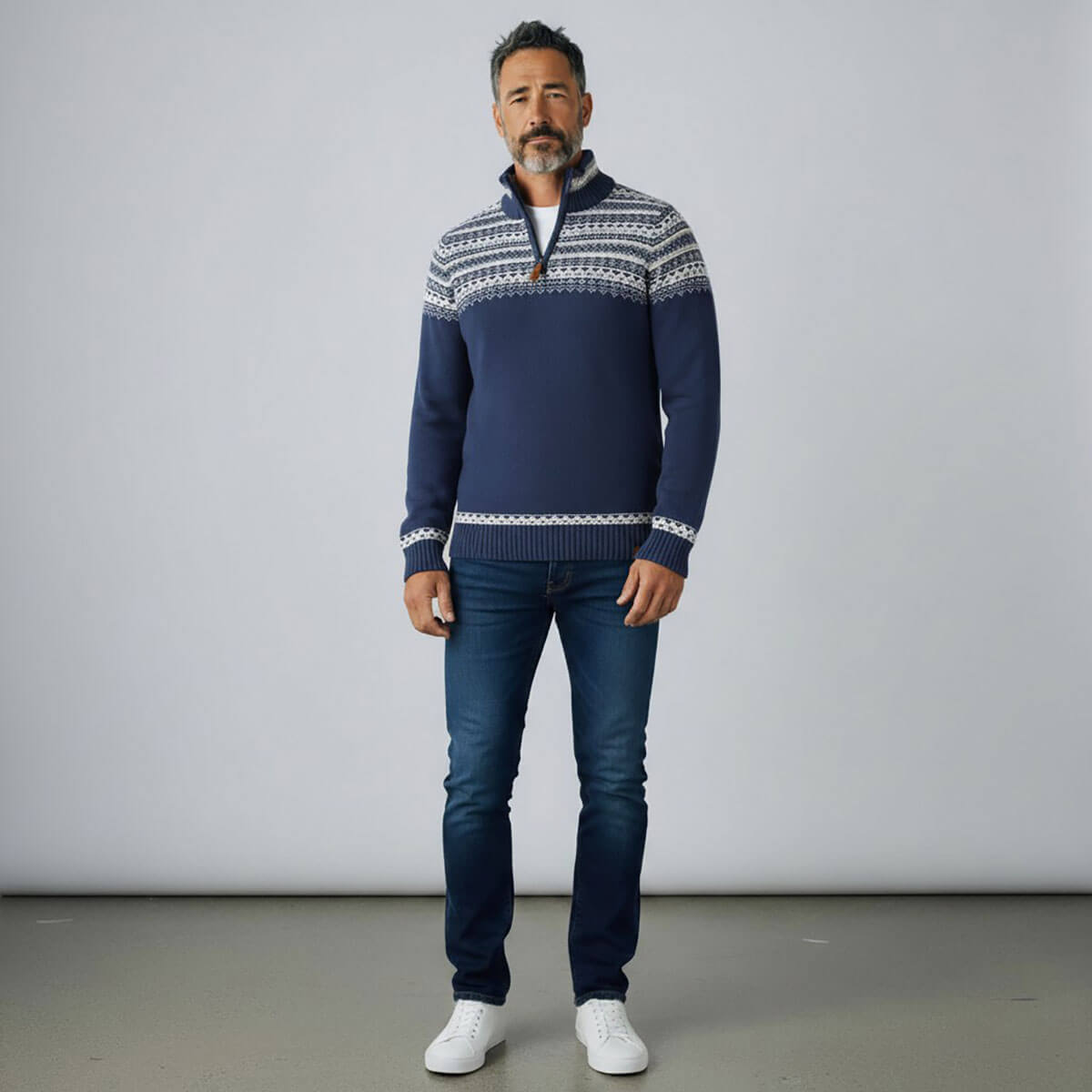 Der klassische Look des Nordens trifft auf modernes Design: Dieser Strick-Troyer für Herren vereint das beliebte Norweger-Strickmuster mit dem maritimen Charme eines Seemannspullovers – perfekt für stilbewusste Männer, die auch an kühlen Tagen nicht auf Komfort und Charakter verzichten wollen.