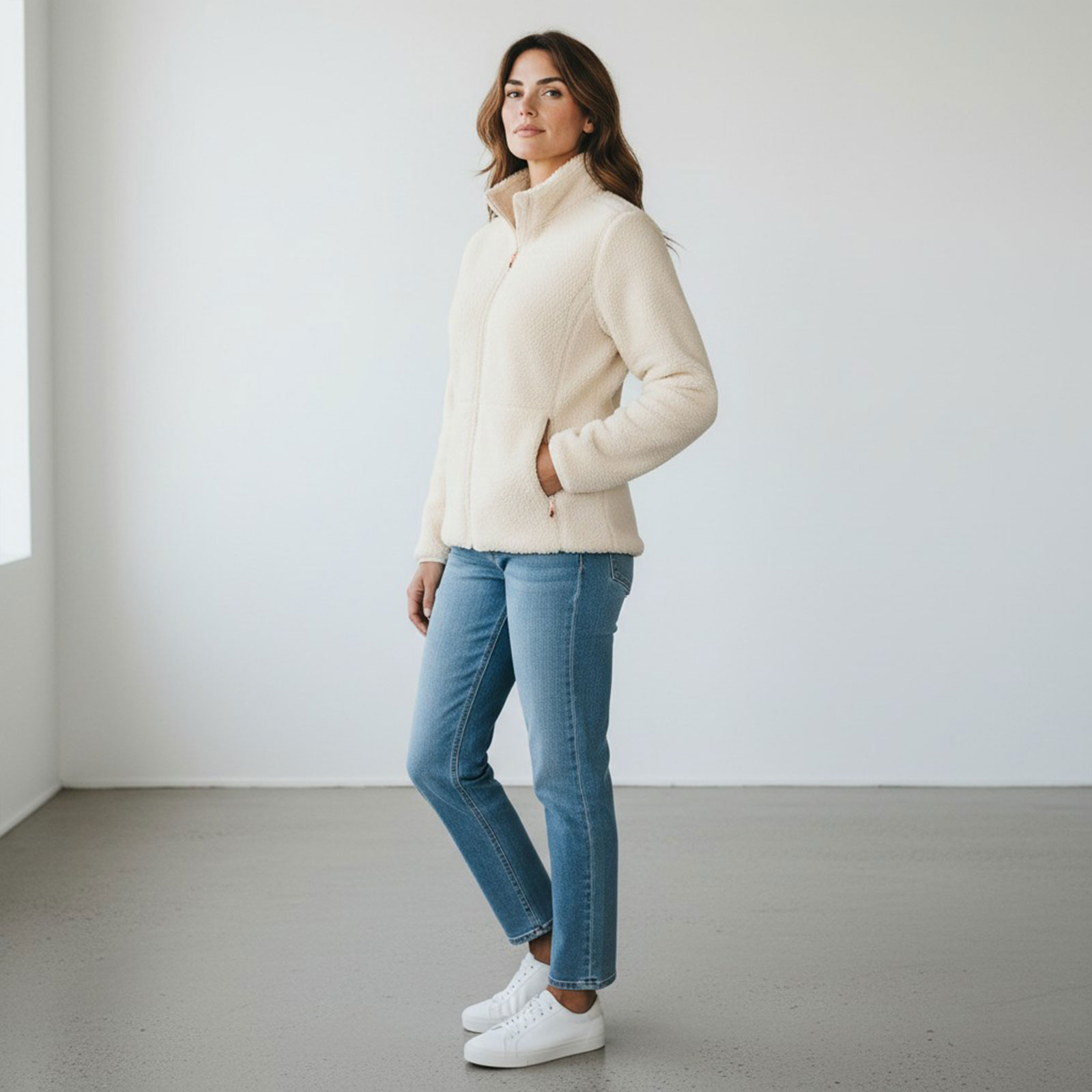 Die Fleecejacke Nele für Damen aus weichem Sherpa-Fleece ist die perfekte Wahl für kühle Tage, ob in der Natur, beim Stadtbummel oder für gemütliche Stunden zu Hause.