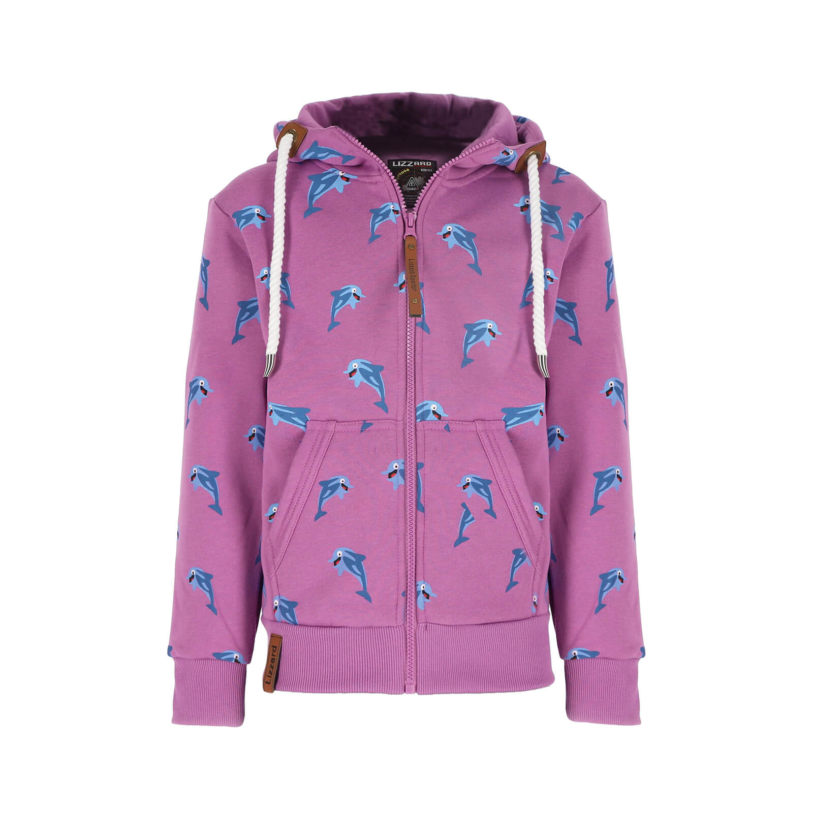 Lizzard Sports Kinder Sweatjacke mit Allover-Delfin-Print - Maritime Kapuzenjacke für Mädchen und Jungen in Lila Größe 104-110