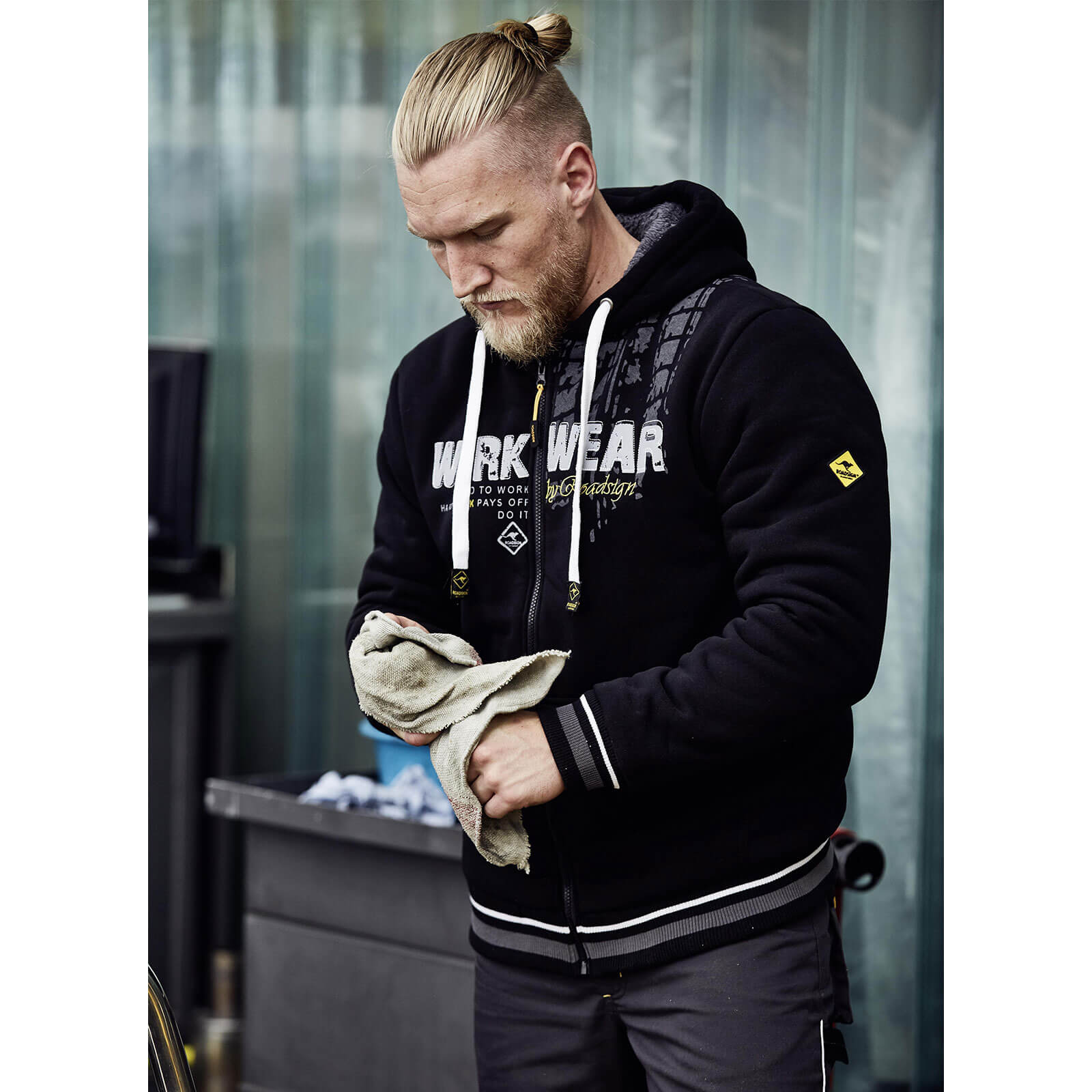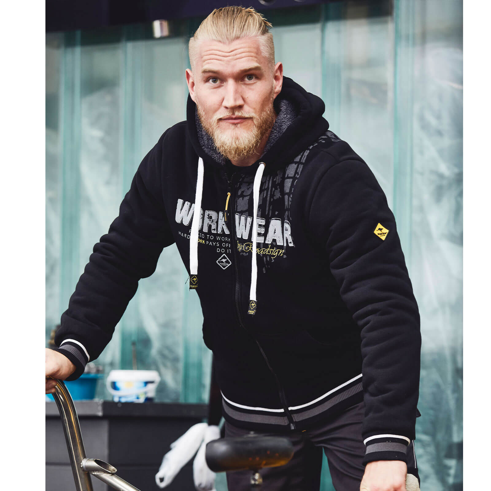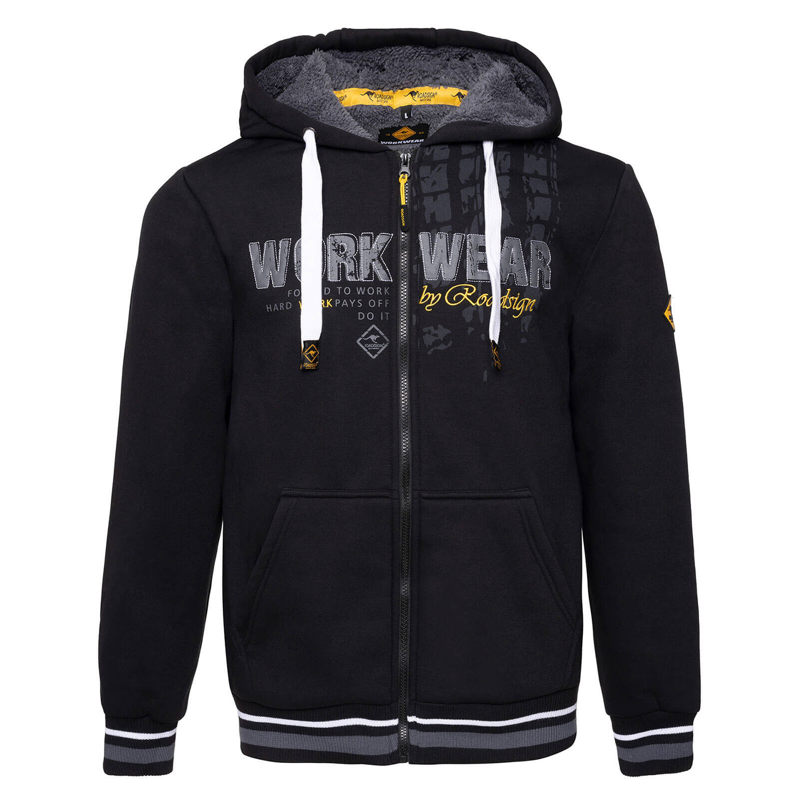 Das kuschelige Berberfleece-Futter sorgt für wohlige Wärme und ein angenehmes Tragegefühl, während die Kapuze mit Zugband zusätzlichen Schutz vor Wind und Wetter bietet. Mit modischen Applikationen und markanten Prints auf der Vorderseite ist diese Arbeitsjacke nicht nur funktional, sondern auch ein echtes Statement. Das Roadsign Markenlabel steht dabei für Qualität, Langlebigkeit und einen zeitgemäßen Look – perfekt für alle, die auch bei der Arbeit nicht auf Stil verzichten wollen. Ob auf der Baustelle, in der Werkstatt oder unterwegs – diese gefütterte Herren Sweatjacke ist der ideale Begleiter für kühle Tage. Die Rippbündchen an Ärmeln und Saum sorgen für einen sicheren Sitz und halten die Kälte draußen.