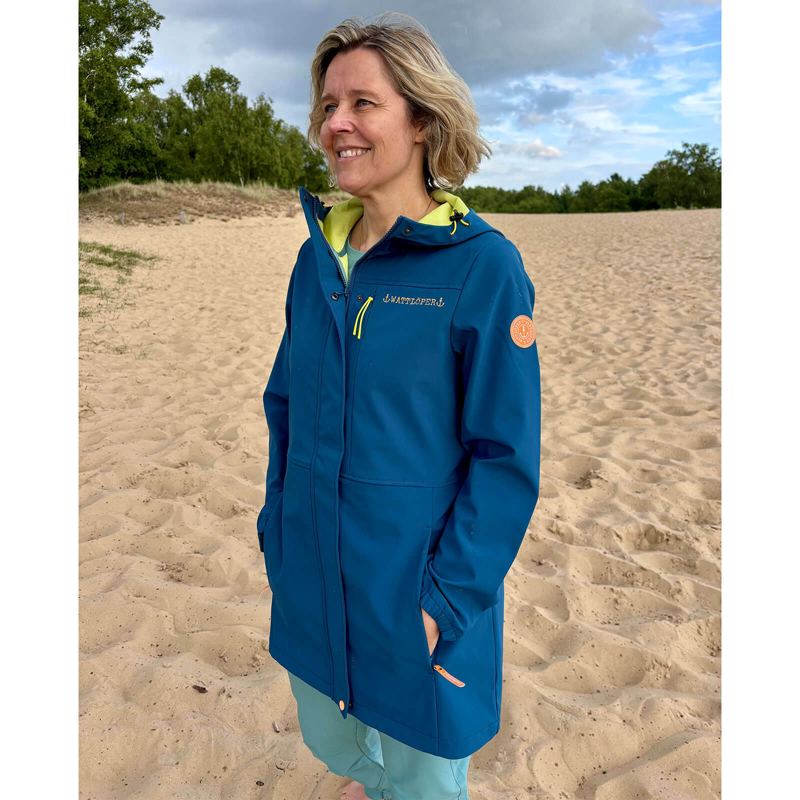 Der unifarbene Outdoor-Funktionsmantel für Damen von Wattlöper verbindet zuverlässige Wetterfunktion mit einem modernen, maritimen Look.
