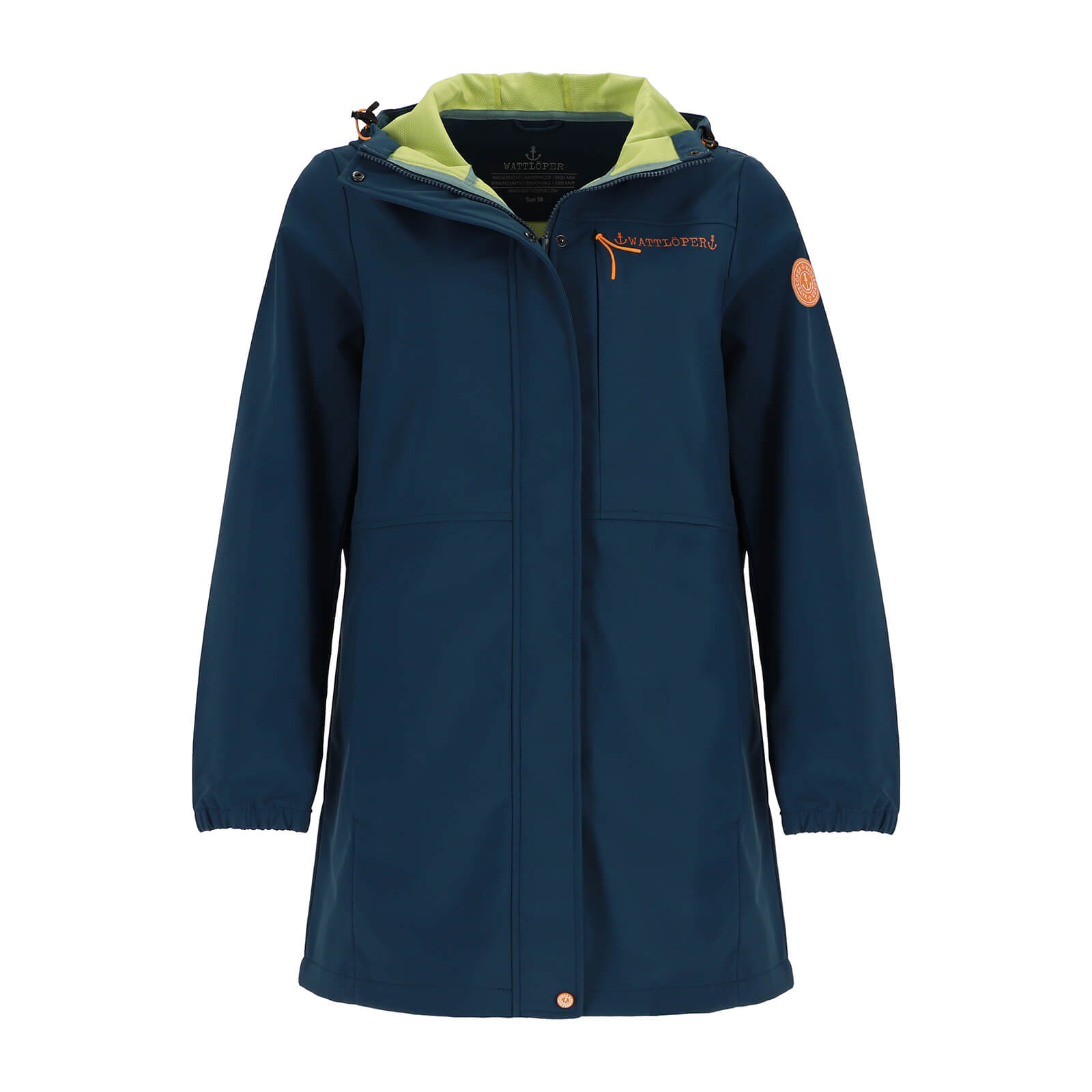Mit einer Wassersäule von 8.000 mm ist der Mantel wind- und wasserabweisend, während die Atmungsaktivität von 3.000 mvp für ein angenehmes Körperklima sorgt. Der gebondete Oberstoff mit kontrastfarbenem Mesh auf der Innenseite erhöht den Komfort und sorgt für ein modernes Finish. Die verstellbare Kapuze mit Print sowie der Print-Schriftzug im Inneren setzen modische Akzente und unterstreichen den typischen Wattlöper-Stil. Dank der verstellbaren Taille im Rücken lässt sich der Mantel individuell anpassen und sorgt für eine feminine Silhouette. Elastische Ärmelabschlüsse schützen zusätzlich vor Wind, während praktische Reißverschlusstaschen sicheren Stauraum für Smartphone, Schlüssel oder andere Essentials bieten. Die hochwertige Sorona®-Qualität steht für Leichtigkeit, Wärmeleistung und Langlebigkeit – ideal für aktive Frauen mit Anspruch an Funktion und Design. Mit einer Rückenlänge von ca. 85 cm bietet der Mantel zusätzlichen Schutz und Komfort an kühleren Tagen.
