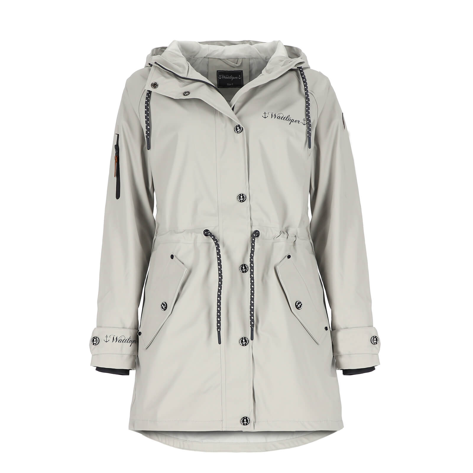 Wattlöper Damen Regenparka mit Kapuze und Taillenzug - Beschichteter Regenmantel in Hellgrau Größe XS