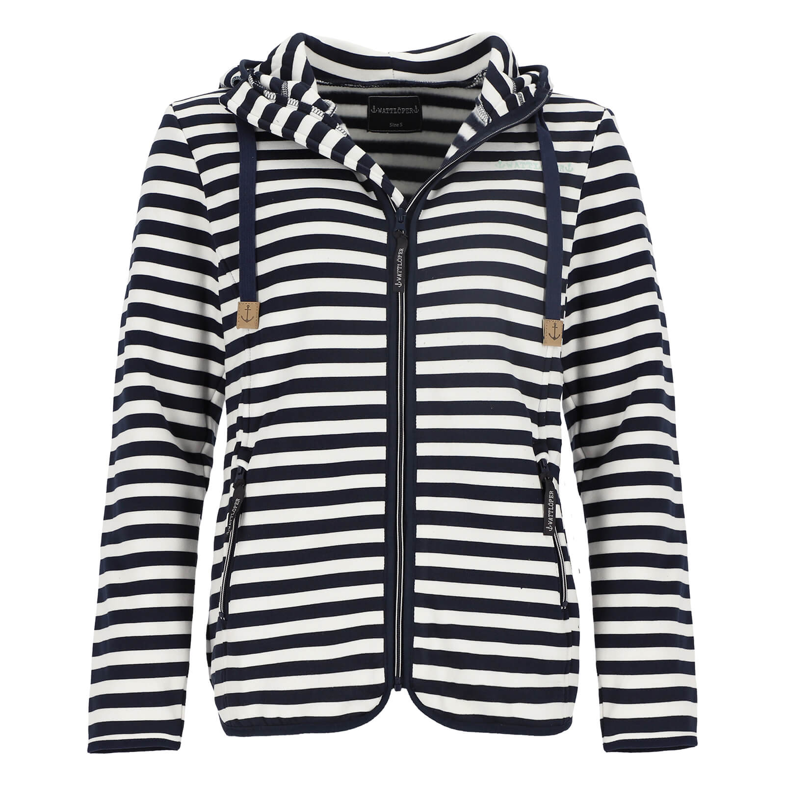 Diese gestreifte Strickfleecejacke für Damen von Wattlöper verbindet maritimen Stil mit funktionalem Tragekomfort.