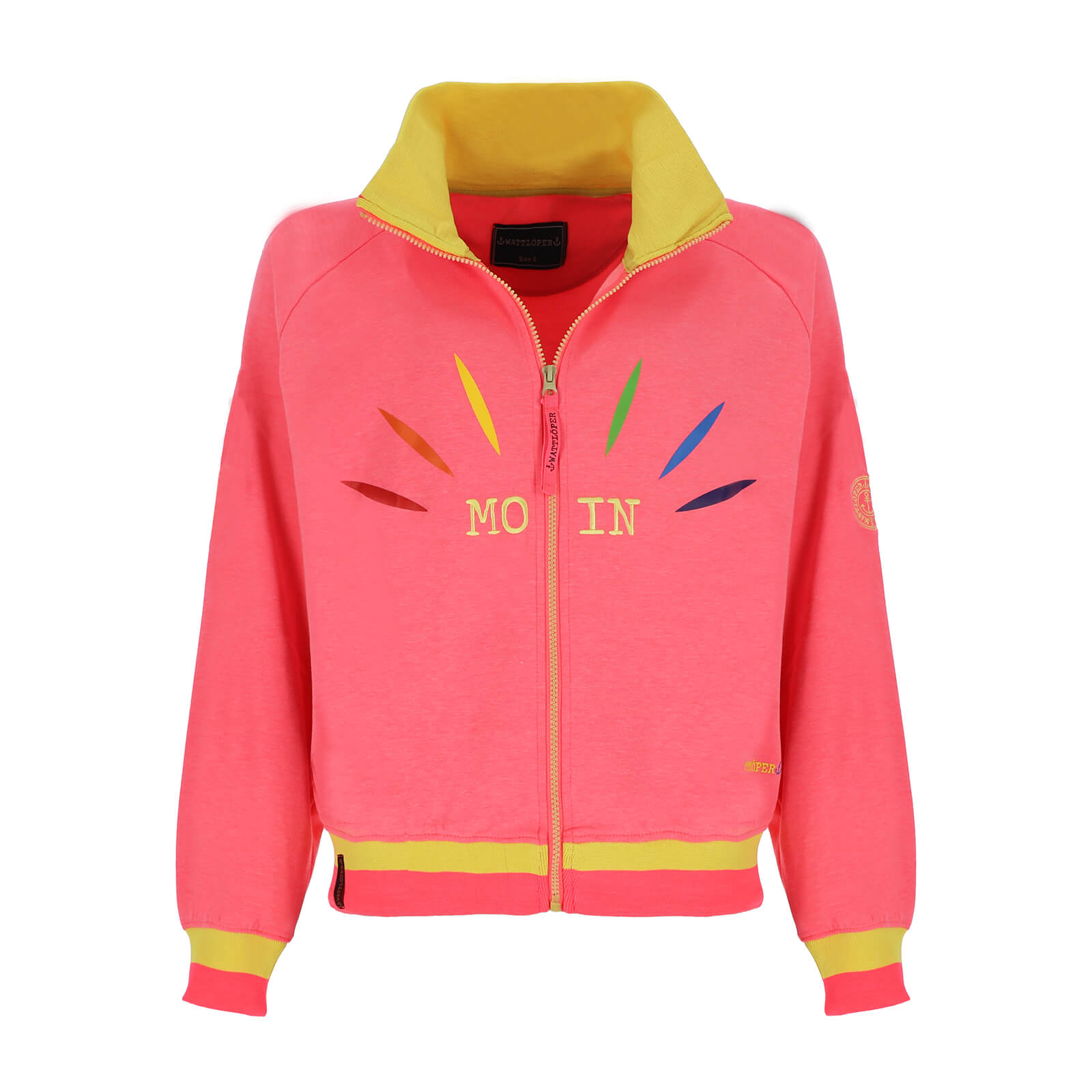 Wattlöper Damen Sweatjacke mit Schriftzug X-Stick "Anker-O-S-W" und Wattlöper - Jacke mit Stehkragen in Pink Größe M