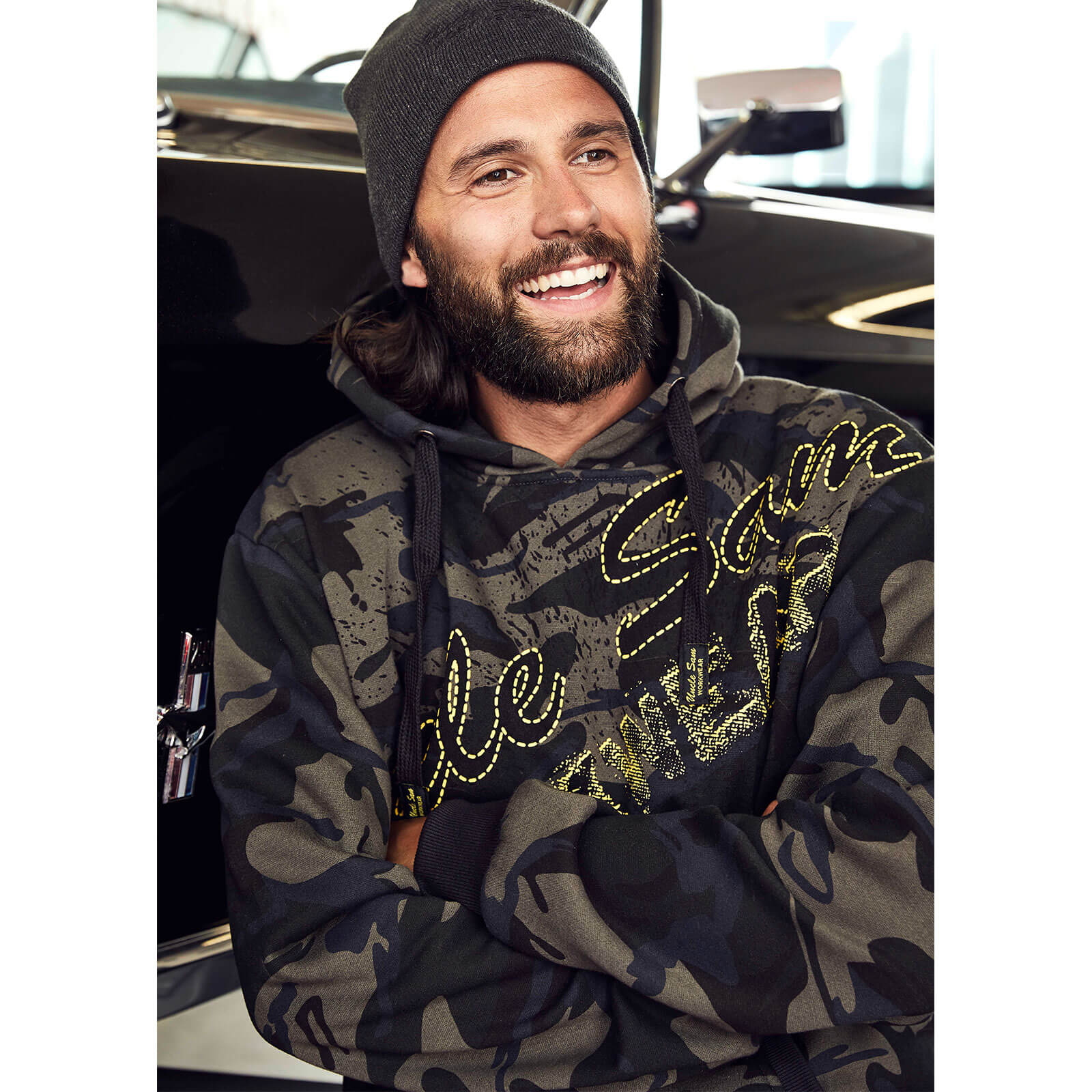 Uncle Sam Herren Sweathoody mit Frontprint - Kapuzenpullover mit Kängurutasche in Oliv Camouflage-Schwarz Größe M