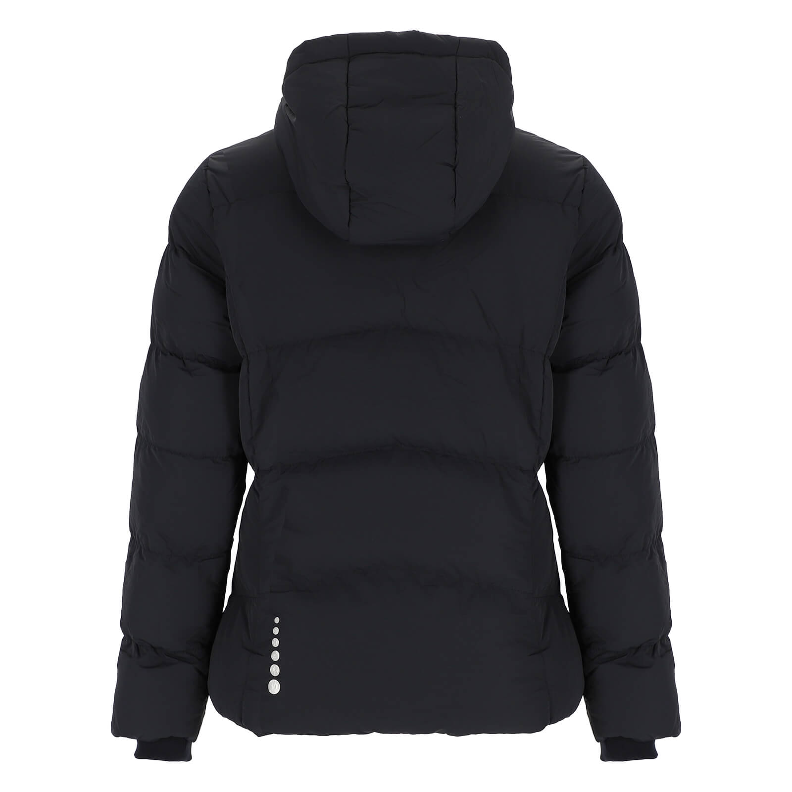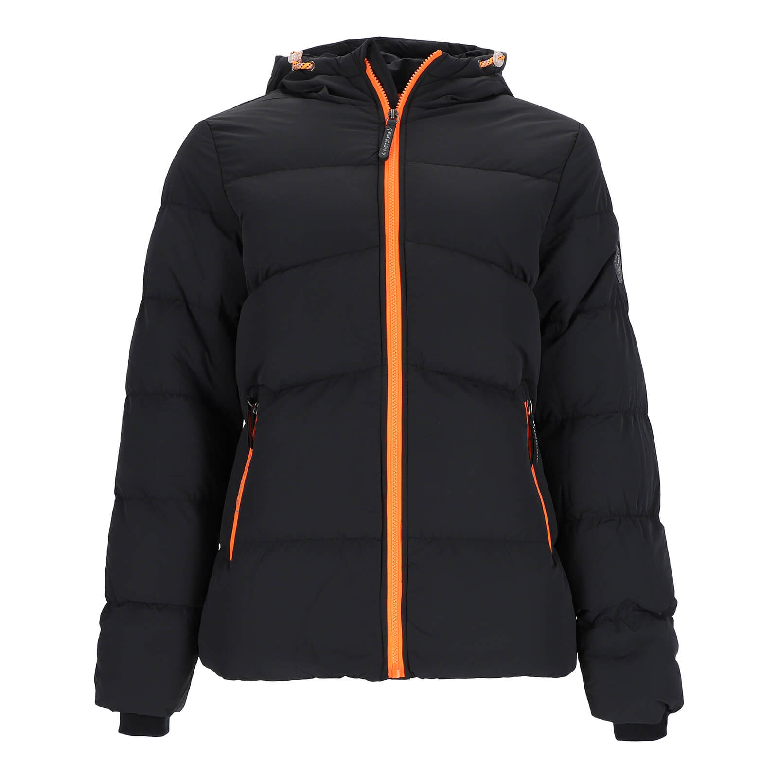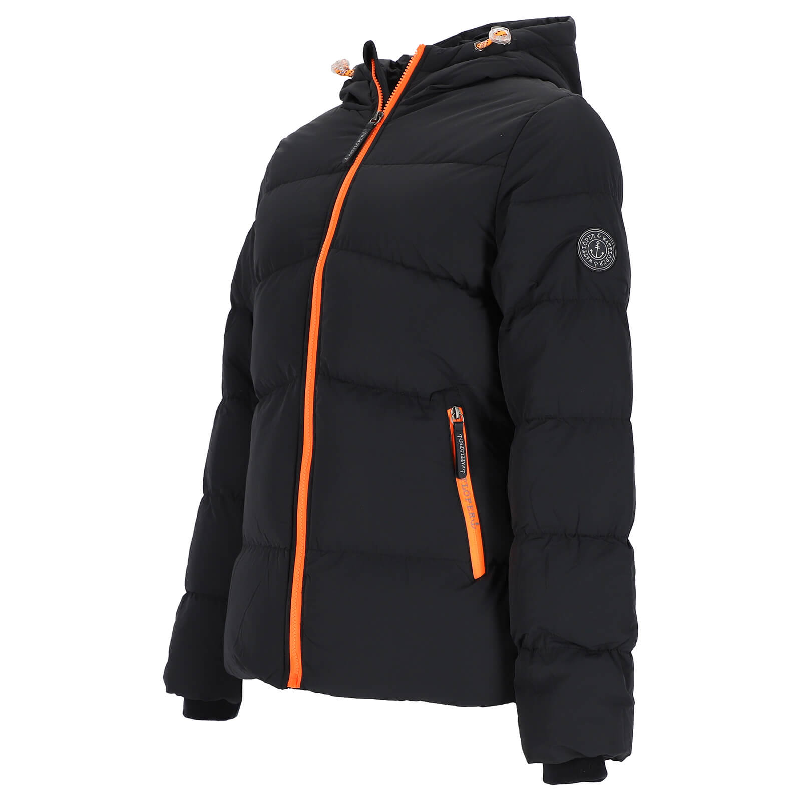 Die angeschnittene, verstellbare Kapuze schützt zuverlässig vor Wind und Wetter, während der durchgehende Frontreißverschluss für einfaches An- und Ausziehen sorgt. Dank der seitlichen Reißverschlusstaschen mit wasserdichtem Zipper und Logodruck bleiben wichtige Kleinigkeiten auch bei Regen sicher verstaut. Die modisch farbigen Details setzen stilvolle Akzente und verleihen der Jacke einen dynamischen, frischen Look. Mit einer Rückenlänge von ca. 65 cm bietet die Steppjacke zudem eine angenehme Passform, die ideal über Pullover oder Strick getragen werden kann.