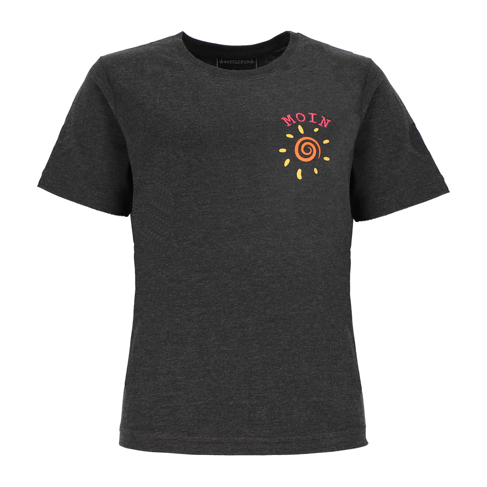 Die feine MOIN-Stickerei auf der linken Brust, kombiniert mit einem Spiralen-Print im Sonnen-Look, verleiht dem Shirt eine frische, maritime Ausstrahlung und macht es zu einem echten Lieblingsstück für Küstenfans. Der klassische Rundhalsausschnitt sorgt für eine zeitlose Passform, während modische Naht-Absetzungen an Ausschnitt, Ärmelenden und Saum dem Kurzarm-Shirt eine hochwertige Optik verleihen. Dezente Markenakzente wie der Markenschriftzug im Nacken und die runde Markenstickerei auf dem linken Ärmel unterstreichen den authentischen Wattlöper-Look. Dank der hochwertigen Verarbeitung und des angenehm weichen Materials bietet dieses Damen T-Shirt mit maritimem Design einen hohen Tragekomfort – ideal für Alltag, Freizeit, Urlaub oder entspannte Tage am Meer.