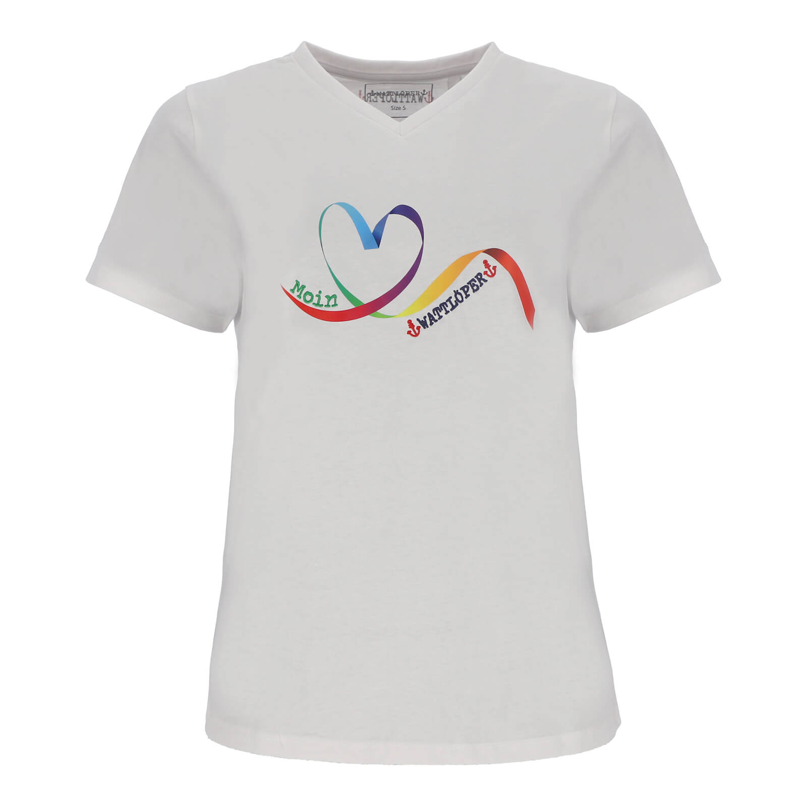 Wattlöper Damen T-Shirt mit Schleifen-Herz-Print und Moin-Stickerei - Kurzarm-Shirt mit V-Ausschnitt in Weiß Größe M