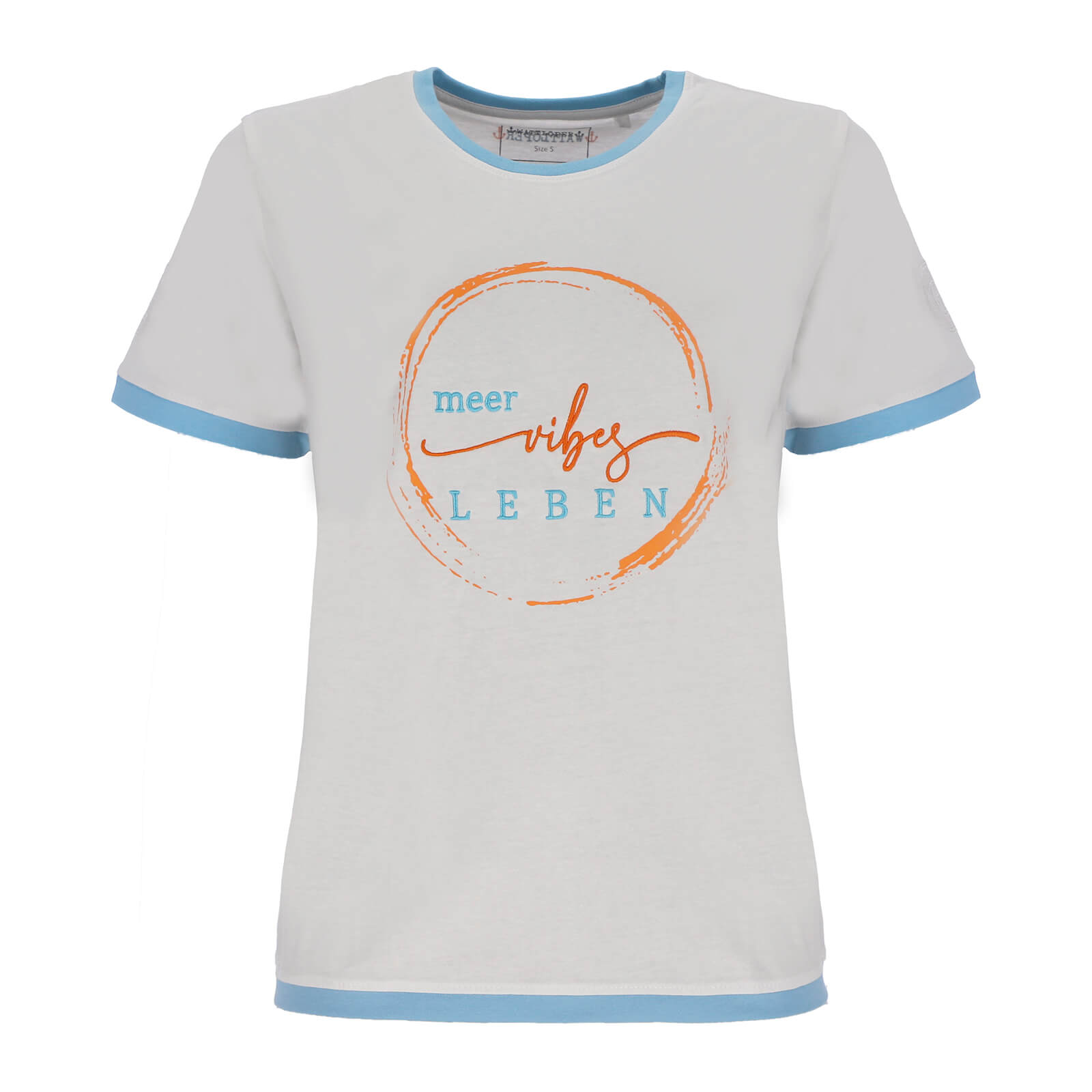 Wattlöper Damen T-Shirt mit Schriftzug-Stickerei Meer-Vibes-Leben - Kurzarm-Shirt mit Rundhalsausschnitt in Weiß Größe M