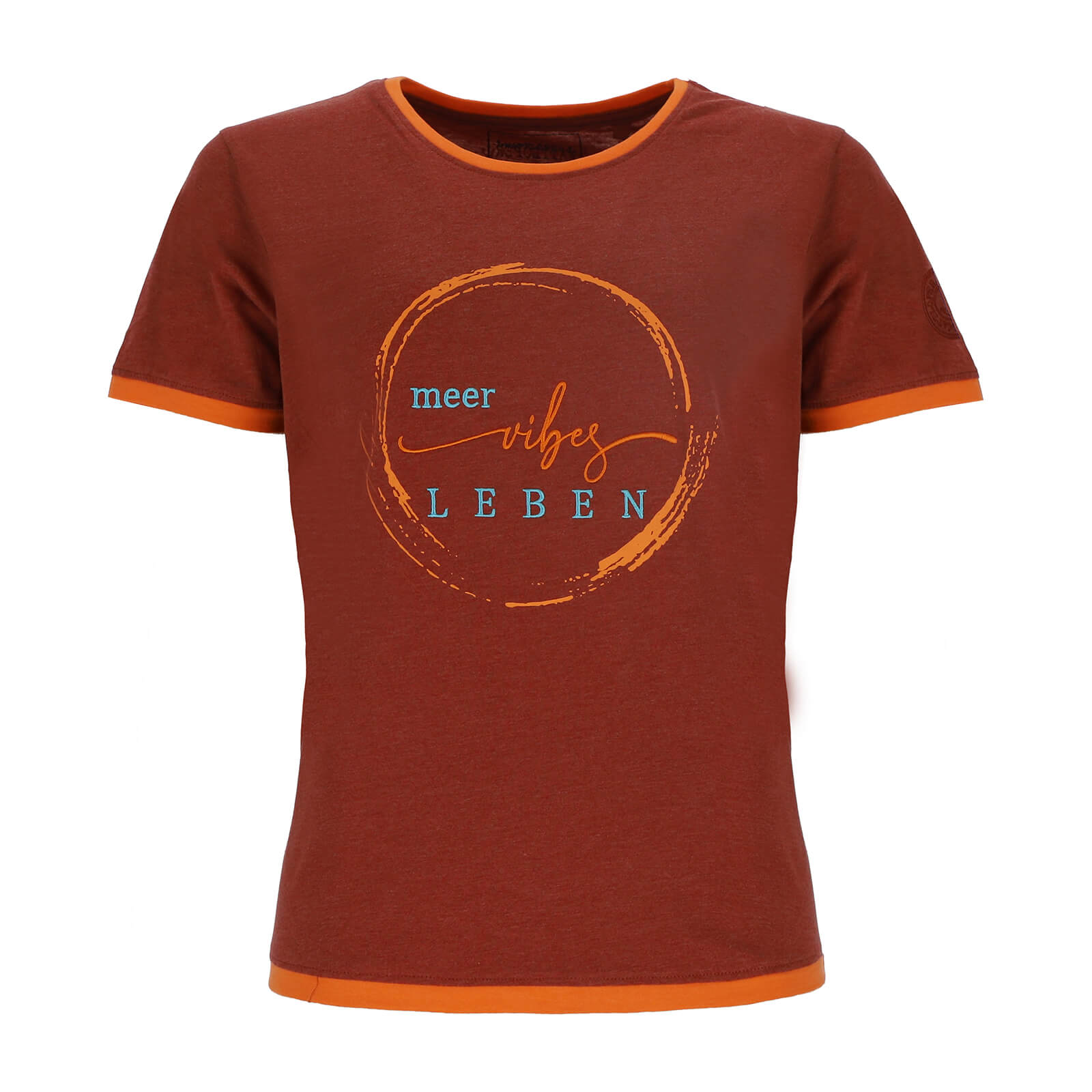 Wattlöper Damen T-Shirt mit Schriftzug-Stickerei Meer-Vibes-Leben - Kurzarm-Shirt mit Rundhalsausschnitt in Rotbraun Größe M